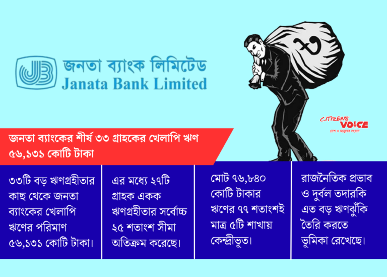 নথি পর্যালোচনায় দেখা গেছে, রাষ্ট্রায়ত্ত জনতা ব্যাংকের ঝুঁকিপূর্ণ বড় ঋণগ্রহীতাদের ওপর নির্ভরতা আরও বেড়েছে। ব্যাংকটির অভ্যন্তরীণ নথি অনুযায়ী, মাত্র ৩৩ জন শীর্ষ গ্রাহকের কাছেই খেলাপি ঋণের পরিমাণ দাঁড়িয়েছে ৫৬ হাজার ১৩১ কোটি টাকা।