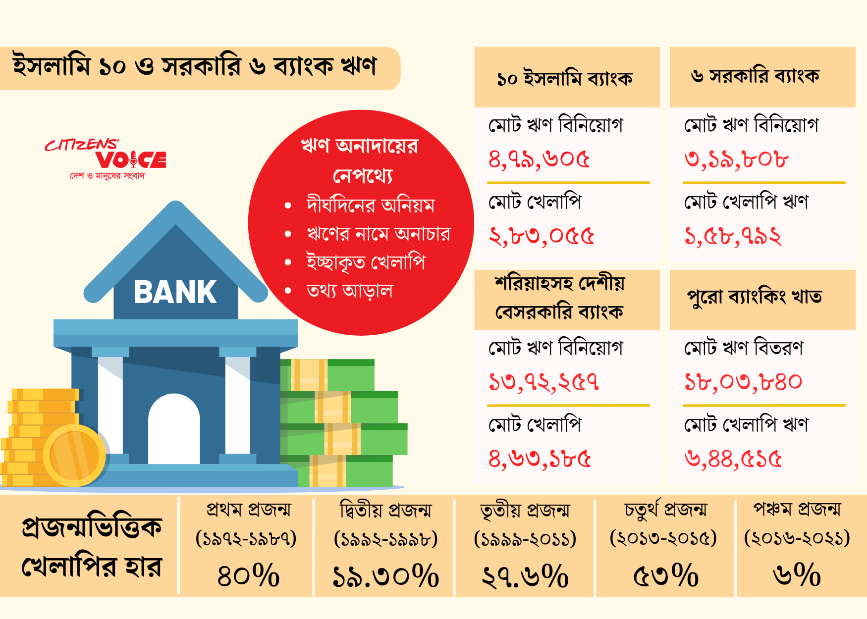 কেন্দ্রীয় ব্যাংকের প্রতিবেদন বিশ্লেষণ করে দেখা গেছে, শরিয়াহভিত্তিক ১০টি ইসলামি ব্যাংক মোট ৪ লাখ ৭৯ হাজার ৬০৫ কোটি টাকা ঋণ বিনিয়োগ করেছে। এর মধ্যে খেলাপি হয়ে গেছে ২ লাখ ৮৩ হাজার ৫৫ কোটি টাকা। হিসাব অনুযায়ী, প্রতি ১০ টাকার প্রায় ৬ টাকাই এখন আদায় অনিশ্চিত। অন্যদিকে শরিয়াহসহ দেশীয় বেসরকারি ব্যাংকগুলোর মোট খেলাপি ঋণের পরিমাণ ৪ লাখ ৬৩ হাজার ১৮৫ কোটি টাকা। যা তাদের মোট ঋণের ৩৩ দশমিক ৭৫ শতাংশ। এই তুলনাই স্পষ্ট করে, খেলাপির বোঝা সবচেয়ে বেশি ইসলামি ব্যাংকগুলোর ঘাড়েই।
