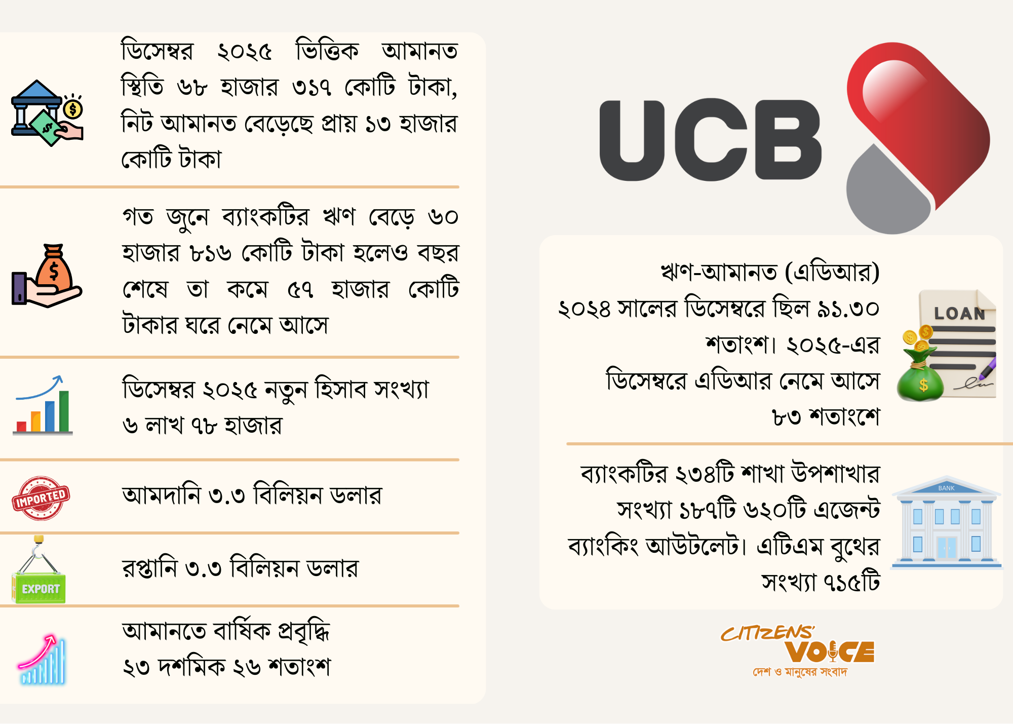 বিদায়ী ২০২৫ সালে বেসরকারি খাতের ইউনাইটেড কমার্শিয়াল ব্যাংক (ইউসিবি) তার নিট আমানত প্রায় ১৩ হাজার কোটি টাকা বৃদ্ধি করেছে। ব্যাংকটির কর্তৃপক্ষ মনে করছে, এটি কেবল নতুন রেকর্ড নয়, ব্যাংকের আর্থিক চিত্র বদলেরও প্রমাণ।