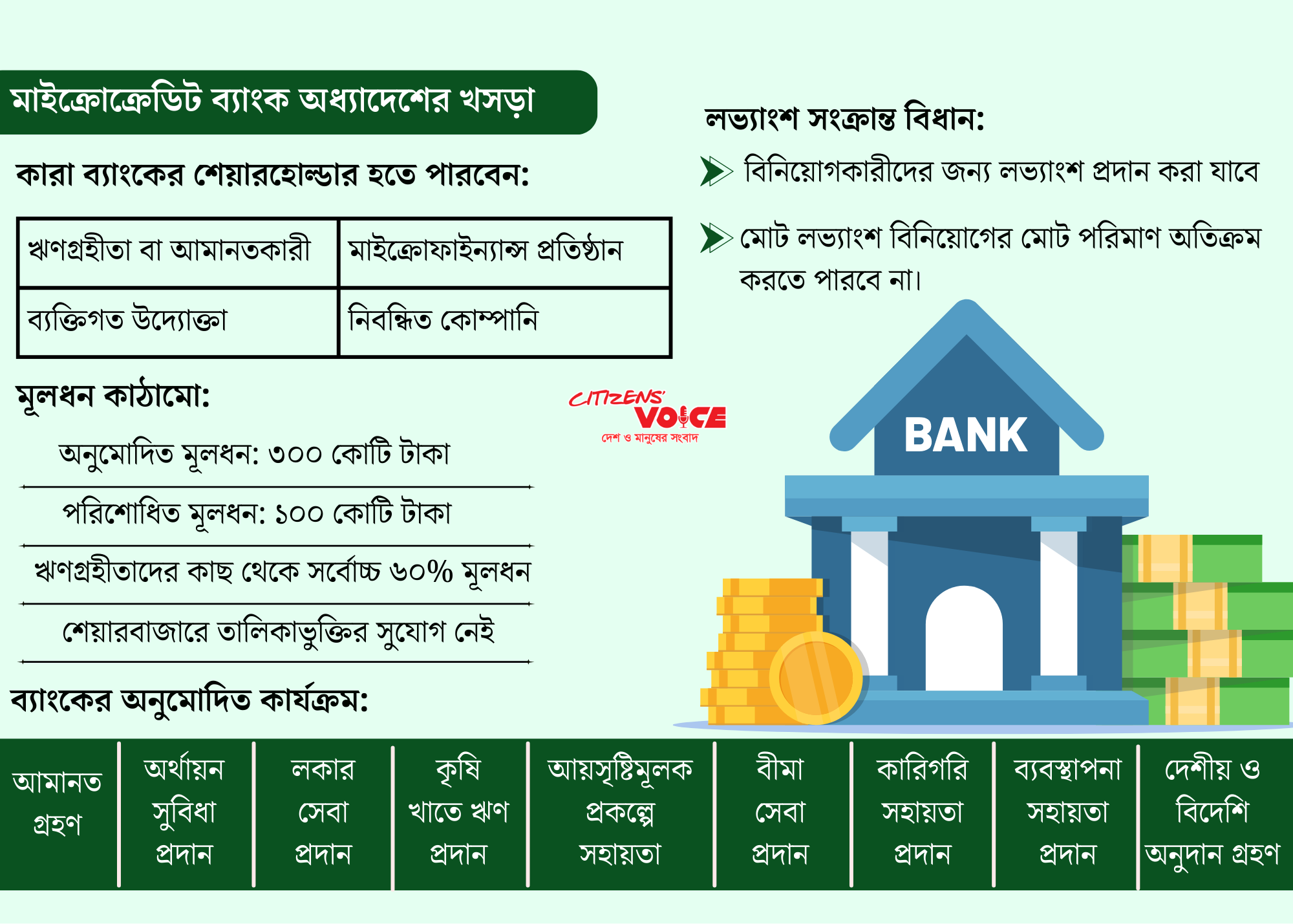 প্রস্তাবিত ব্যাংকগুলো মূলত বাংলাদেশে মাইক্রোফাইন্যান্স খাতকে নতুনভাবে পরিচালনার সুযোগ দেবে। এই ব্যাংকগুলো শেয়ারহোল্ডারের বিনিয়োগ গ্রহণ করতে পারবে এবং ডিভিডেন্ড বিতরণ করতে পারবে, যা দীর্ঘদিন ধরে পুনঃবিনিয়োগ ও সামাজিক সম্প্রসারণের উপর ভিত্তি করে থাকা খাতে মুনাফা উদ্দীপনা যোগ করবে।