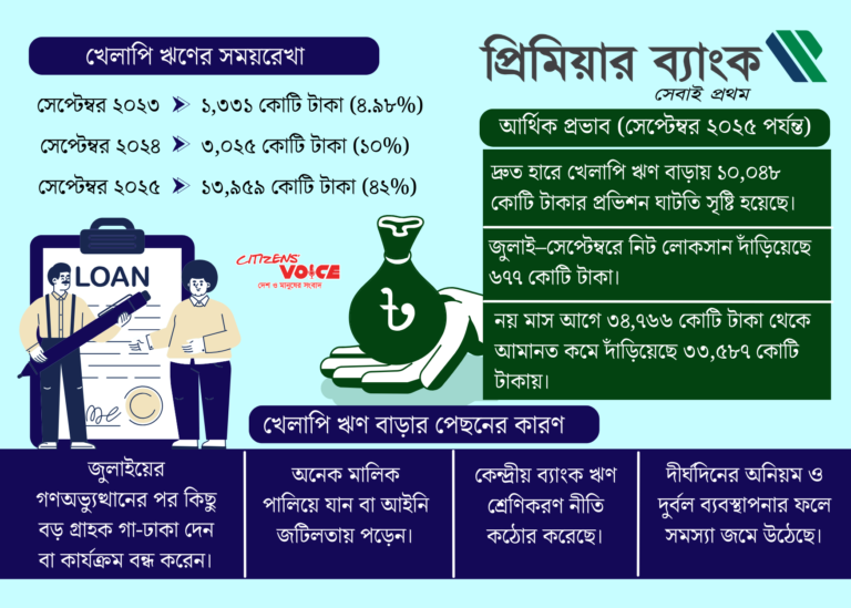 বাংলাদেশ ব্যাংকের তথ্য অনুযায়ী, সেপ্টেম্বর ২০২৫ পর্যন্ত তৃতীয় প্রজন্মের এই ব্যাংকের খারাপ ঋণ বেড়ে দাঁড়িয়েছে ৪২ শতাংশে বা ১৩,৯৫৯ কোটি টাকায়। এর আগে ২০২৪ সালের একই সময়ে এই হার ছিল ১০ শতাংশ এবং এক বছর আগে ছিল পাঁচ শতাংশেরও কম। এই ঋণের ঊর্ধ্বগতির ফলে ব্যাংককে বিপুল পরিমাণে প্রভিডেনশন (সংরক্ষণী) করতে হয়েছে। তবুও প্রিমিয়ার ব্যাংক পূর্ণ নিয়মিত প্রভিডেনশন দিতে ব্যর্থ হয়েছে। বাংলাদেশ ব্যাংকের তথ্য অনুযায়ী, প্রভিডেনশন ঘাটতি দাঁড়িয়েছে ১০,০৪৮ কোটি টাকায়।