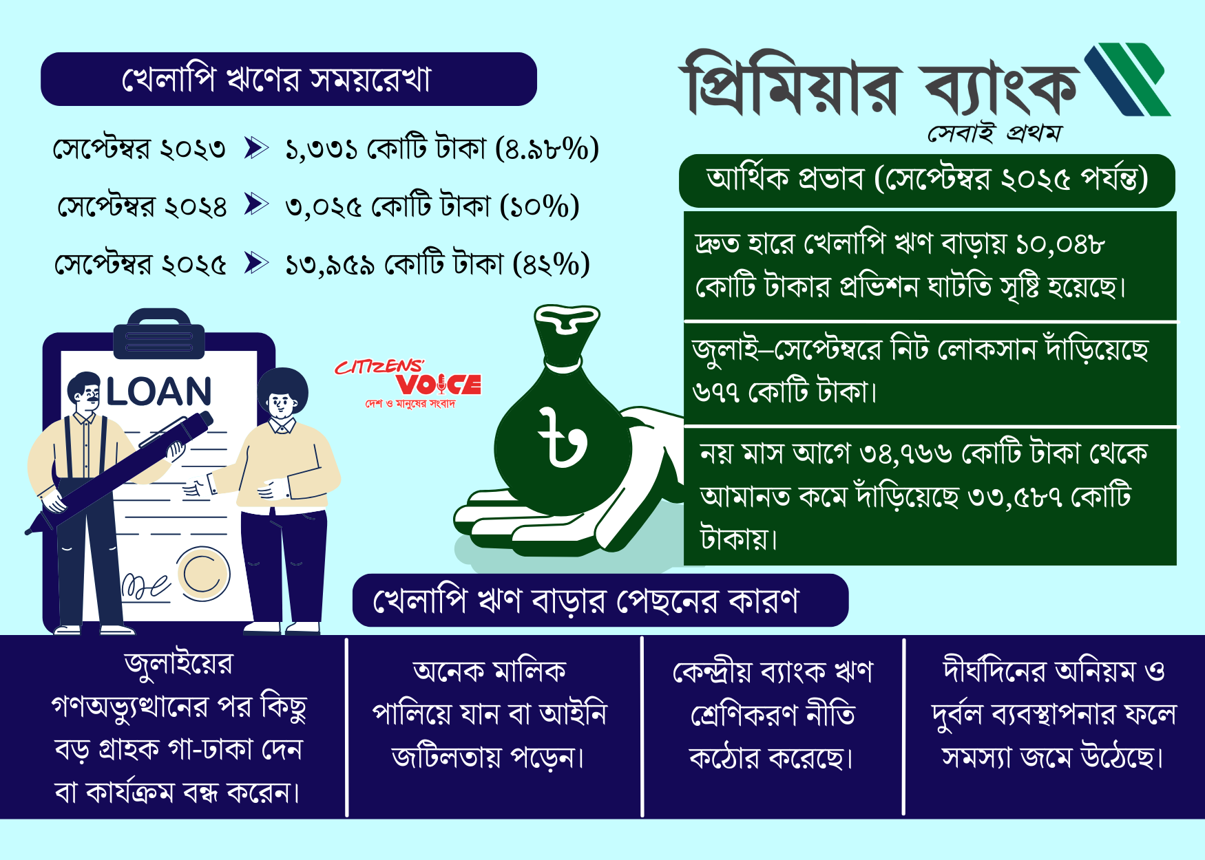 প্রতিষ্ঠার ১৯৯৯ সাল থেকে প্রিমিয়ার ব্যাংক তার ব্যবসায়িক ভাবমূর্তিকে মসৃণ ও দৃঢ় দেখানোর চেষ্টা করে আসছিল কিন্তু সাম্প্রতিক তথ্য দেখাচ্ছে, সেই ভাবমূর্তি এখন ধ্বংসের মুখে। মাত্র এক বছরে ব্যাংকের খারাপ ঋণ প্রায় পাঁচগুণ বেড়ে গেছে, যা ব্যালান্স শীটকে তেমনভাবে ক্ষতিগ্রস্ত করেছে যে তা আর লুকানো যাচ্ছে না।