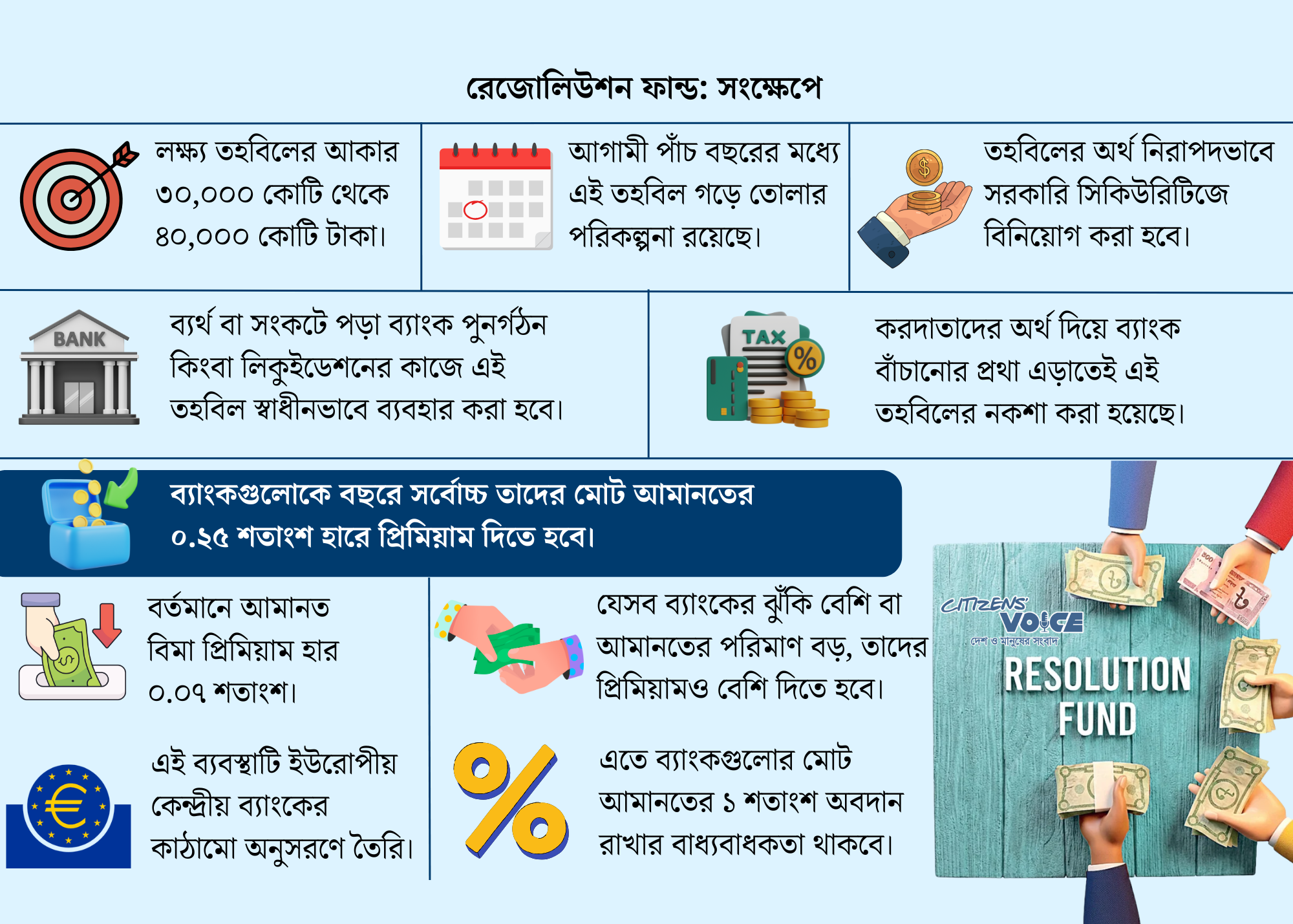 ব্যাংকগুলোকে তাদের আমানতের ০.২৫% বা প্রতি ১০০ টাকার ২৫ পয়সা বার্ষিক প্রিমিয়াম হিসেবে এই তহবিলে জমা দিতে হবে। বর্তমানে আমানত বীমা সুরক্ষা তহবিলের জন্য ব্যাংকগুলোকে মাত্র ০.০৭% প্রিমিয়াম দিতে হয়। আশা করা হচ্ছে, সময়ের সঙ্গে সঙ্গে এই তহবিল ৩০ থেকে ৪০ হাজার কোটি টাকার মধ্যে জমা হবে। এটি কেন্দ্রীয় ব্যাংককে স্বাধীনভাবে হস্তক্ষেপ করার সুযোগ দেবে যখন কোনো ব্যাংক গুরুতর আর্থিক সমস্যায় পড়বে।