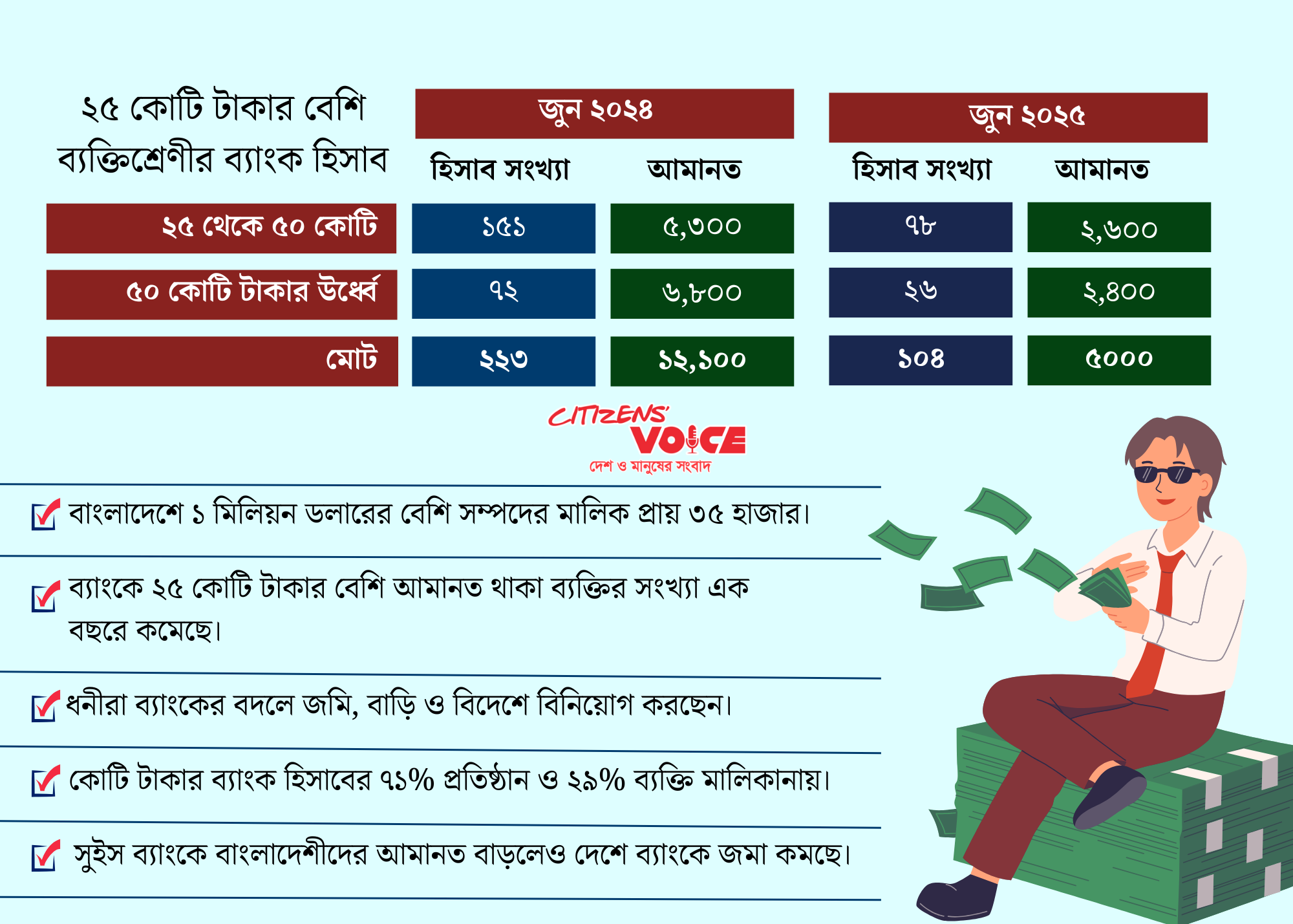 ব্যক্তির ১ কোটি টাকার বেশি ব্যাংক হিসাবের সংখ্যা ৩৭ হাজার ৩৬টি। এর মধ্যে ২৫ থেকে ৫০ কোটি টাকার হিসাব মাত্র ৭৮টি, জমা ২,৬০০ কোটি টাকা। ২০২৪ সালের জুনে ১৫১টি হিসাবের আমানত ছিল ৫,৩০০ কোটি টাকা। ৫০ কোটি টাকার বেশি ব্যাংক হিসাব ২০২৫ সালের জুনে ২৬টি, যেখানে আমানত ২,৪০০ কোটি টাকা।