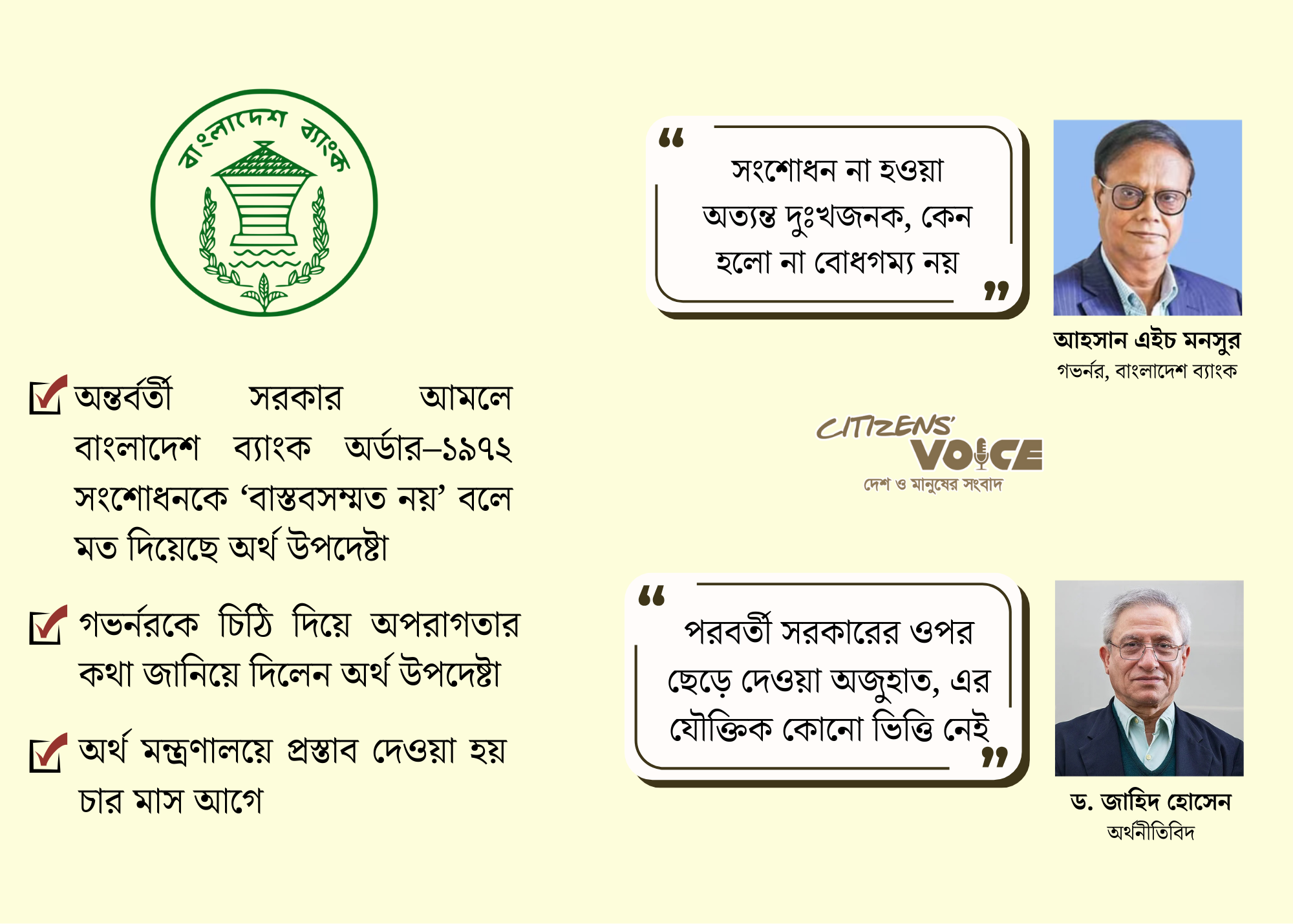 বিশ্বব্যাংকের ঢাকা অফিসের সাবেক প্রধান অর্থনীতিবিদ ড. জাহিদ হোসেন মনে করেন, বাংলাদেশ ব্যাংক অর্ডার সংশোধনের খসড়া অনেক আগেই প্রস্তুত ছিল। এখন তা আটকে যাওয়ার যৌক্তিক ব্যাখ্যা নেই। তাঁর মতে, অর্থ মন্ত্রণালয়ের আর্থিক প্রতিষ্ঠান বিভাগ সম্ভবত সংশোধন চায় না।