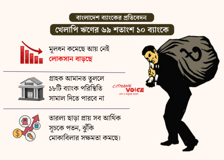 তারল্য পরীক্ষা অনুযায়ী, ১৮টি ব্যাংক পাঁচ দিনের অতিরিক্ত আমানত উত্তোলনের চাপ সহ্য করতে পারবে না। খেলাপি ঋণ কেবল বেড়েই চলেছে, তা কেন্দ্রীয়ভাবে কয়েকটি ব্যাংকে বেশি সংযুক্ত হয়ে আছে। মোট খেলাপি ঋণের ৬৯ শতাংশ মাত্র ১০ ব্যাংকে, আর ৫ ব্যাংকে মিলিতভাবে ৪৭ শতাংশ খেলাপি ঋণ আছে।