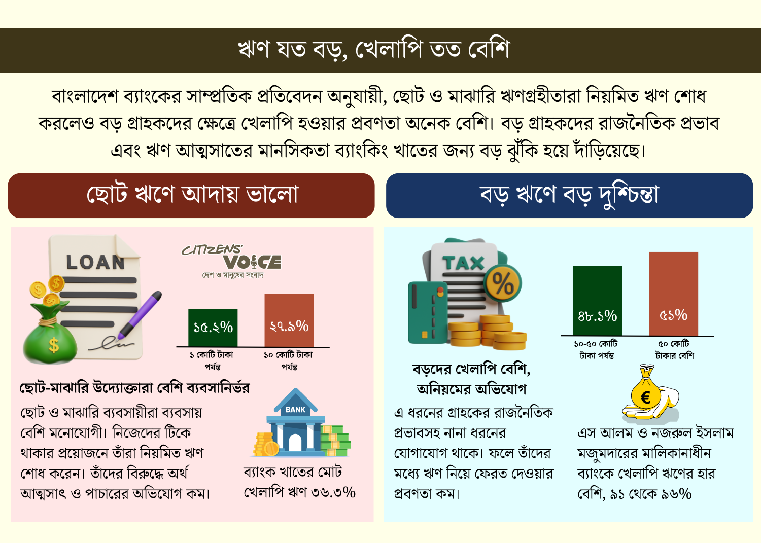 ব্যাংক খাতসংশ্লিষ্টদের দাবি, এই প্রবণতা আর্থিক সুশাসনের জন্য উদ্বেগজনক। তাঁদের মতে, ছোট ও মাঝারি উদ্যোক্তারাই এখনো অর্থনীতির প্রধান চালিকাশক্তি। বড় ঋণের কিছু গ্রাহকের বিরুদ্ধে খেলাপির পাশাপাশি অর্থ পাচারের অভিযোগ রয়েছে, যা খাতটির স্থিতিশীলতায় চাপ সৃষ্টি করছে।