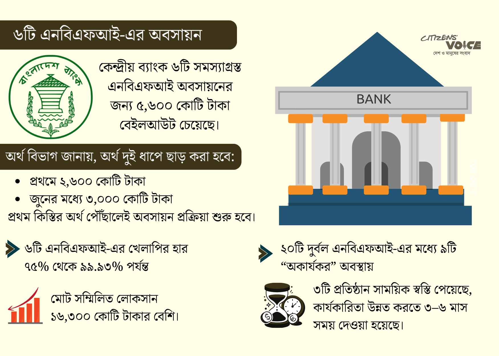 সমস্যাগ্রস্ত ২০ প্রতিষ্ঠানে আমানত রয়েছে ২২,১২৭ কোটি টাকা। এর মধ্যে গ্রাহকদের নিট ব্যক্তি আমানত প্রায় ৪,৯৭১ কোটি টাকা। অবসায়ন ও পুনর্গঠন প্রক্রিয়ায় এই অর্থের জোগান প্রাথমিকভাবে প্রয়োজন হতে পারে বলে মনে করছে কেন্দ্রীয় ব্যাংক। এছাড়া, অবসায়নের পর কর্মচারীদের চাকরিবিধি অনুযায়ী সব সুবিধা দেওয়া হবে।
