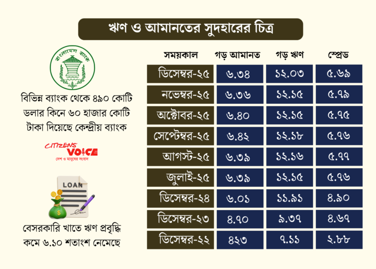 বাংলাদেশ ব্যাংকের তথ্যে দেখা গেছে, ডিসেম্বরে ব্যাংক খাতের গড় ঋণ সুদহার ১২.০৩ শতাংশে নেমেছে। এর আগে অক্টোবর-নভেম্বর মাসে এটি ১২.১৫ শতাংশ এবং সেপ্টেম্বরে ১২.১৮ শতাংশ ছিল। জানুয়ারি ও ফেব্রুয়ারিতে অনেক ব্যাংক আরও কম সুদে ঋণ দিতে শুরু করেছে। বর্তমানে ভালো অবস্থানে থাকা কিছু ব্যাংক ১০–১১ শতাংশ সুদে ঋণ দিচ্ছে।