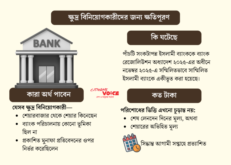 গত বছর শেষের দিকে পাঁচটি আর্থিকভাবে দুর্বল বেসরকারি ব্যাংক মিলিত হয়ে সম্মিলিত ইসলামী ব্যাংক গঠন করা হয়। এ ধাক্কায় ক্ষতিগ্রস্ত ছোট বিনিয়োগকারীদের ক্ষতিপূরণ দেওয়ার প্রস্তুতি শুরু করেছে সরকার, নিশ্চিত করেছেন সংশ্লিষ্ট কর্তৃপক্ষ।