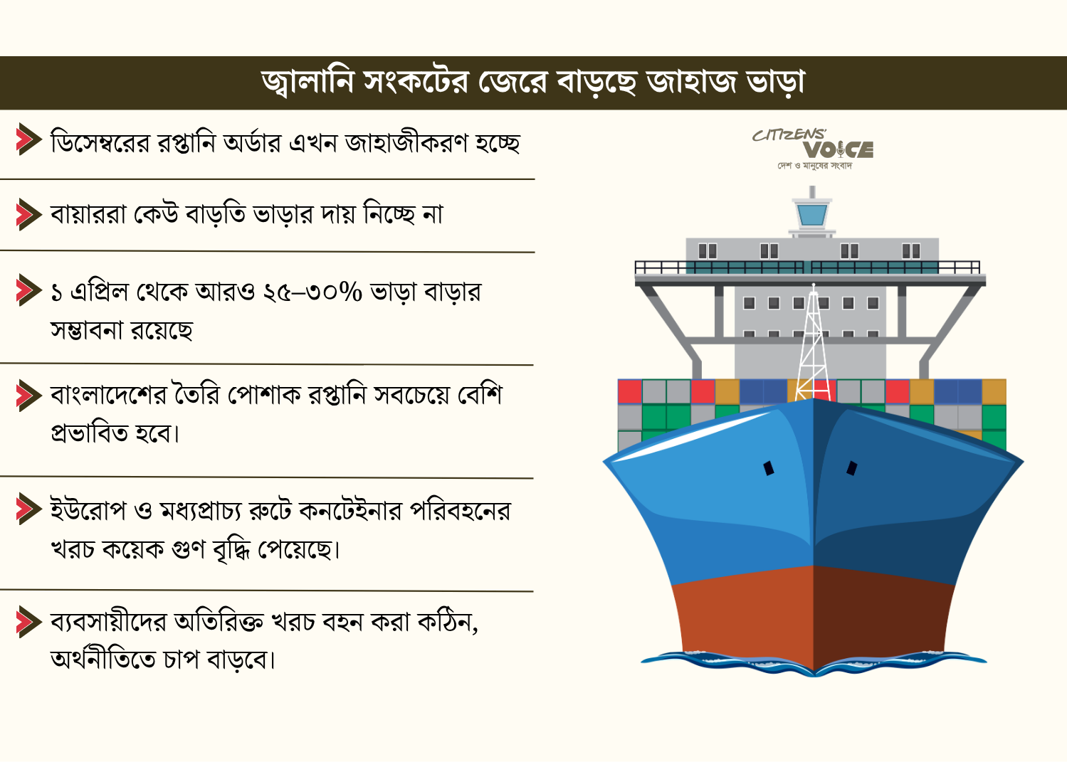 শিপিং কোম্পানিগুলো ১ এপ্রিল থেকে ভাড়া বাড়ানোর উদ্যোগ নিয়েছে। আন্তর্জাতিক বাজারে জ্বালানি তেলের ঊর্ধ্বগতি ও যুদ্ধ ঝুঁকি ভাড়া বৃদ্ধির প্রধান কারণ হিসেবে দেখানো হয়েছে। যদিও নির্দিষ্ট হারে ভাড়া বৃদ্ধির ঘোষণা এখনও হয়নি, তবে সংশ্লিষ্টরা ধারণা করছেন এপ্রিলেও মার্চের মতো ২৫ থেকে ৩০ শতাংশ পর্যন্ত ভাড়া বাড়তে পারে। মেইন লাইন অপারেটররা ইতোমধ্যে বিষয়টি স্থানীয় এজেন্টদের মৌখিকভাবে জানিয়েছেন এবং আজ মঙ্গলবার লিখিতভাবে জানানো হবে।