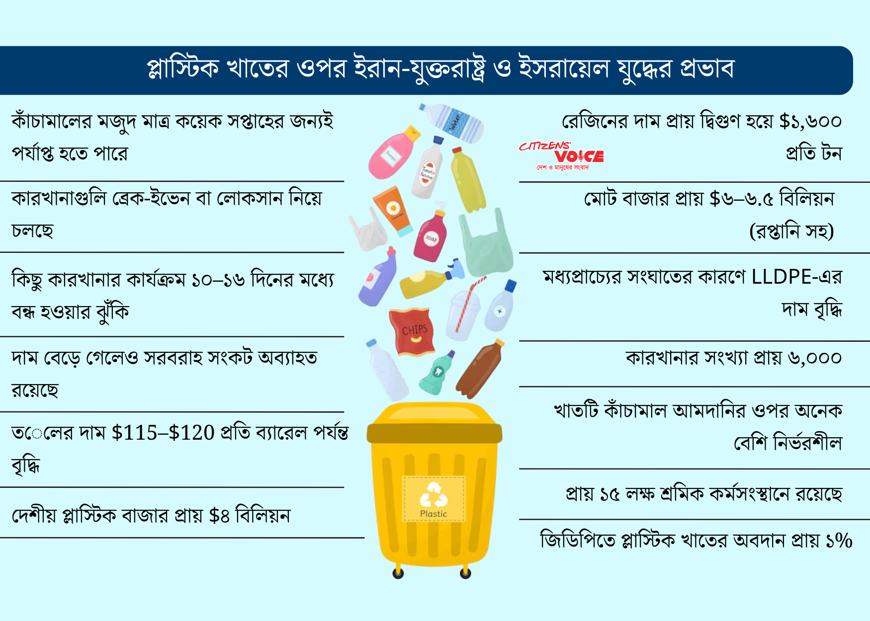 বিশ্বব্যাপী জ্বালানি ও পেট্রোকেমিক্যাল বাজারে অস্থিরতার কারণে বাংলাদেশে প্লাস্টিক শিল্প গভীর সংকটে পড়েছে। দেশীয় শিল্প জগত বলছে, চলমান মার্কিন ও ইস্রায়েল-ইরান সংঘাত কাঁচামাল সরবরাহ ও মূল শিপিং রুটে চাপ সৃষ্টি করছে।