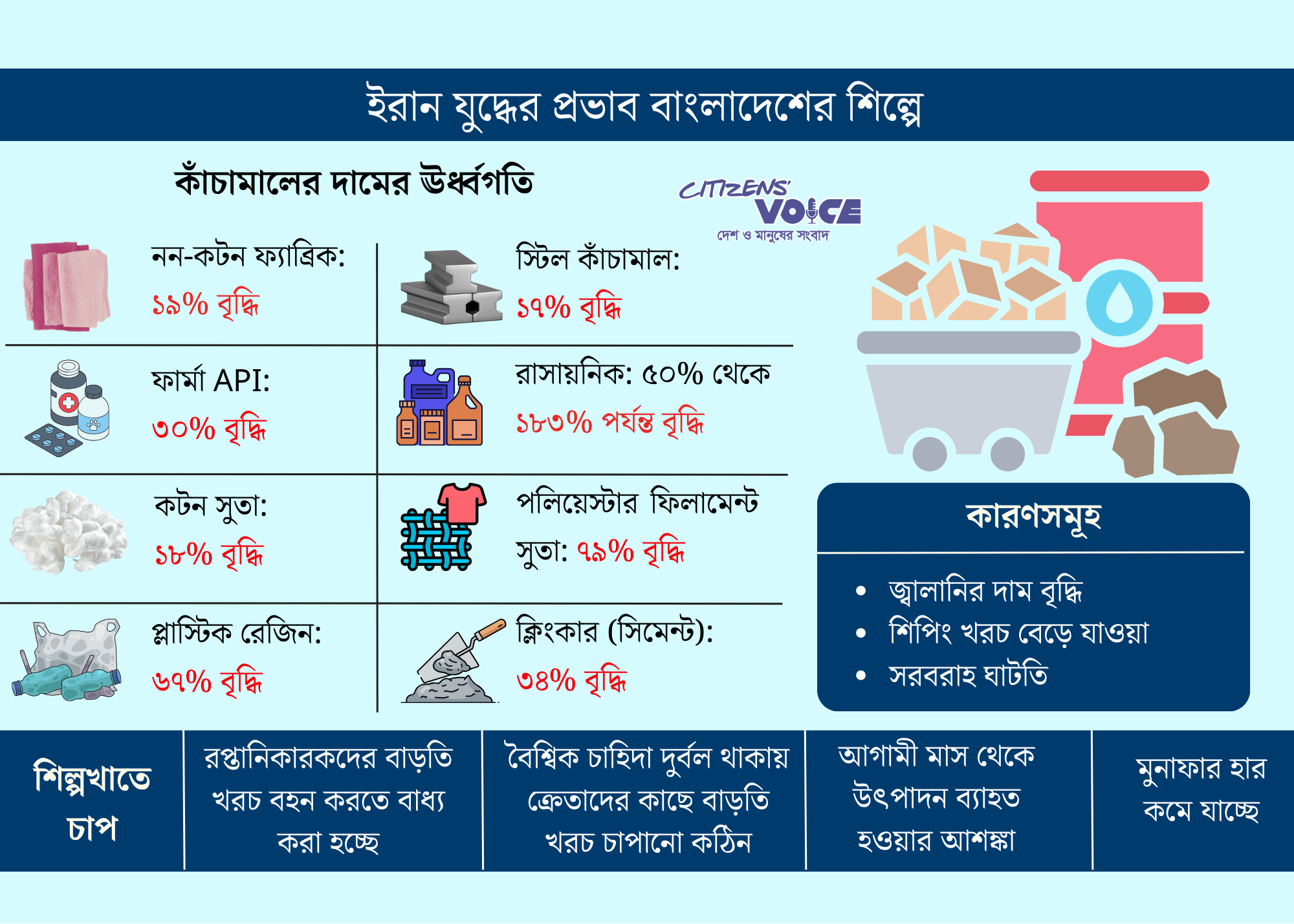 একাধিক উৎপাদক জানান, কাঁচামাল ও রাসায়নিক আমদানি ব্যয় ১০ থেকে সর্বোচ্চ ১৮৩ শতাংশ পর্যন্ত বেড়েছে। নন-কটন ফেব্রিকের দাম প্রায় ১৯ শতাংশ, পলিয়েস্টার ফিলামেন্ট সুতা ৭৯ শতাংশ, কটন সুতা ১৮ শতাংশ, রাসায়নিক ৫০–১৮৩ শতাংশ, ইস্পাত ১৭ শতাংশ, ক্লিংকার ৩৪ শতাংশ, প্লাস্টিক রজন ৬৭ শতাংশ এবং ওষুধ শিল্পের অ্যাকটিভ ফার্মাসিউটিক্যাল ইনগ্রেডিয়েন্টস (এপিআই) প্রায় ৩০ শতাংশ বৃদ্ধি পেয়েছে।