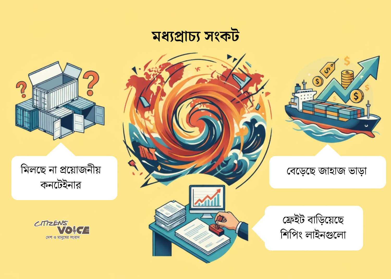 ব্যবসায়ী ও সংশ্লিষ্ট খাতের প্রতিনিধিরা জানান, মধ্যপ্রাচ্যের সংকটের কারণে আন্তর্জাতিক শিপিং রুটে বড় ধরনের চাপ তৈরি হয়েছে। বিশেষ করে হরমুজ প্রণালি দিয়ে জাহাজ চলাচল সীমিত হয়ে পড়ায় অনেক শিপিং লাইন বিকল্প রুট ব্যবহার করছে। এতে সময় ও খরচ দুটোই বেড়ে গেছে। এর পাশাপাশি কনটেইনার ঘাটতি দেখা দিয়েছে। অনেক ট্রান্সশিপমেন্ট বন্দরে আমদানি করা কাঁচামাল আটকে পড়ছে। আবার রপ্তানির জন্য প্রয়োজনীয় জাহাজও সময়মতো পাওয়া যাচ্ছে না।