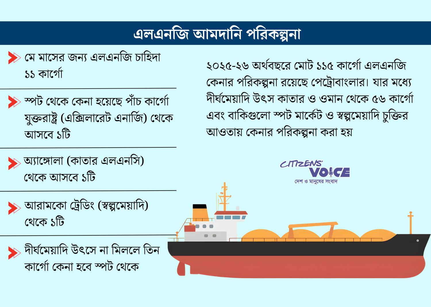 ২০২৫–২৬ অর্থবছরের জন্য পেট্রোবাংলা মোট ১১৫টি এলএনজি কার্গো আমদানির পরিকল্পনা করেছে। এর মধ্যে ৫৬টি কার্গো আসার কথা কাতার ও ওমান থেকে। বাকি অংশ স্পট মার্কেট ও স্বল্পমেয়াদি চুক্তির মাধ্যমে সংগ্রহের লক্ষ্য রয়েছে। তবে মধ্যপ্রাচ্যের সংঘাত পরিস্থিতির কারণে কাতার এনার্জির এলএনজি স্থাপনাগুলো ক্ষতিগ্রস্ত হয় এবং তারা সরবরাহে “ফোর্স মেজর” ঘোষণা করে। এই পরিস্থিতিতে বাংলাদেশের নির্ধারিত কার্গোগুলোও অনিশ্চয়তার মধ্যে পড়ে। ফোর্স মেজর সাধারণত যুদ্ধ, দুর্যোগ বা মহামারির মতো অপ্রতিরোধ্য কারণে চুক্তি সাময়িকভাবে স্থগিত রাখার একটি আইনি ব্যবস্থা।
