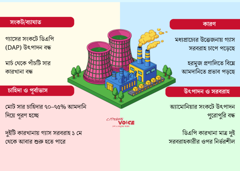 বর্তমান পরিস্থিতিতে শুধু উৎপাদন নয়, আমদানি ব্যবস্থাও আন্তর্জাতিক জটিলতার কারণে অনিশ্চয়তায় পড়েছে। মধ্যপ্রাচ্যের ভূরাজনৈতিক উত্তেজনা এবং গুরুত্বপূর্ণ শিপিং রুটে বিঘ্নের কারণে সরবরাহ ব্যবস্থায় ঝুঁকি তৈরি হয়েছে। এর আগে গ্যাস সংকটের কারণে দেশের পাঁচটি ইউরিয়া সার কারখানা একসঙ্গে সাময়িকভাবে বন্ধ করা হয়েছিল। প্রাথমিকভাবে এটি ১৫ দিনের জন্য বন্ধ রাখার সিদ্ধান্ত নেওয়া হলেও, পরিস্থিতি দীর্ঘায়িত হওয়ায় এখনো অনেক কারখানা পুনরায় চালু করা সম্ভব হয়নি।