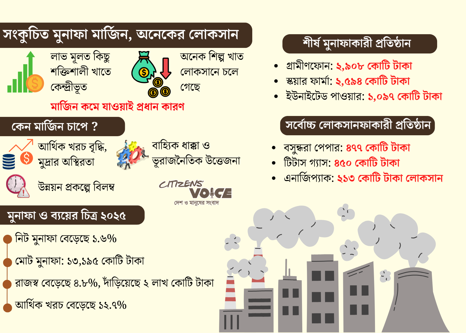 বিশ্লেষকদের মতে, ২০২৫ সালের শেষ প্রান্তিকে পরিস্থিতি আরও খারাপ হয়। ওই সময়ে আগের প্রান্তিকের তুলনায় আয় কমেছে ২ শতাংশ এবং মুনাফা কমেছে প্রায় ১০ শতাংশ। নির্বাচনের পর অর্থনৈতিক পরিস্থিতি কিছুটা উন্নতির আশা তৈরি হলেও আন্তর্জাতিক উত্তেজনা, বিশেষ করে মধ্যপ্রাচ্য পরিস্থিতির কারণে সেই আশাবাদ টেকেনি।