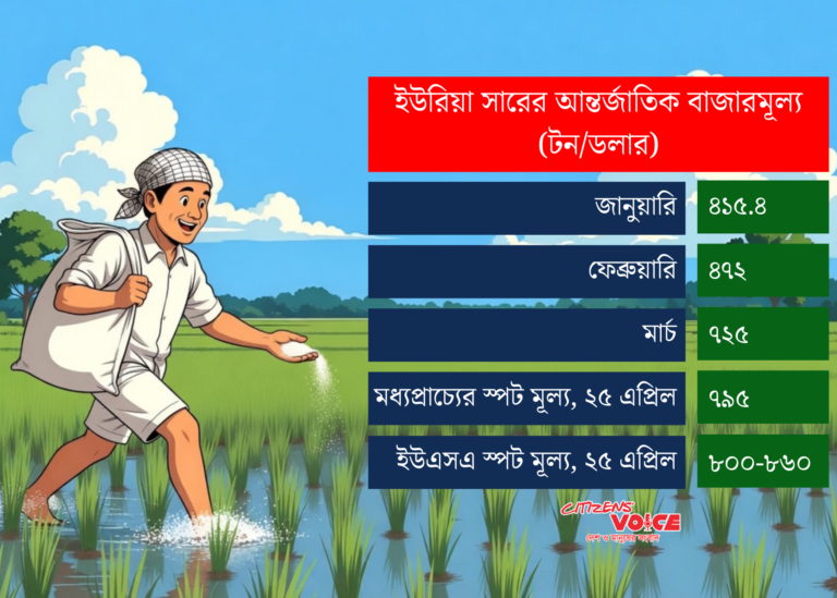 বিশ্বব্যাংকের এপ্রিল ২০২৬-এর কমোডিটি প্রতিবেদন অনুযায়ী, জানুয়ারিতে ইউরিয়ার গড় আন্তর্জাতিক দাম ছিল টনপ্রতি ৪১৫ দশমিক ৪ ডলার। ফেব্রুয়ারিতে তা বেড়ে দাঁড়ায় ৪৭২ ডলারে। এরপর মার্চে দাম লাফিয়ে বেড়ে ৭২৫ দশমিক ৬ ডলারে পৌঁছায়। সর্বশেষ স্পট বাজারে প্রতি টনের দাম ৮০০ ডলার ছাড়িয়ে গেছে, আর শনিবার শিকাগো বোর্ড অব ট্রেডে তা ৮৫০ ডলারে উঠেছে।