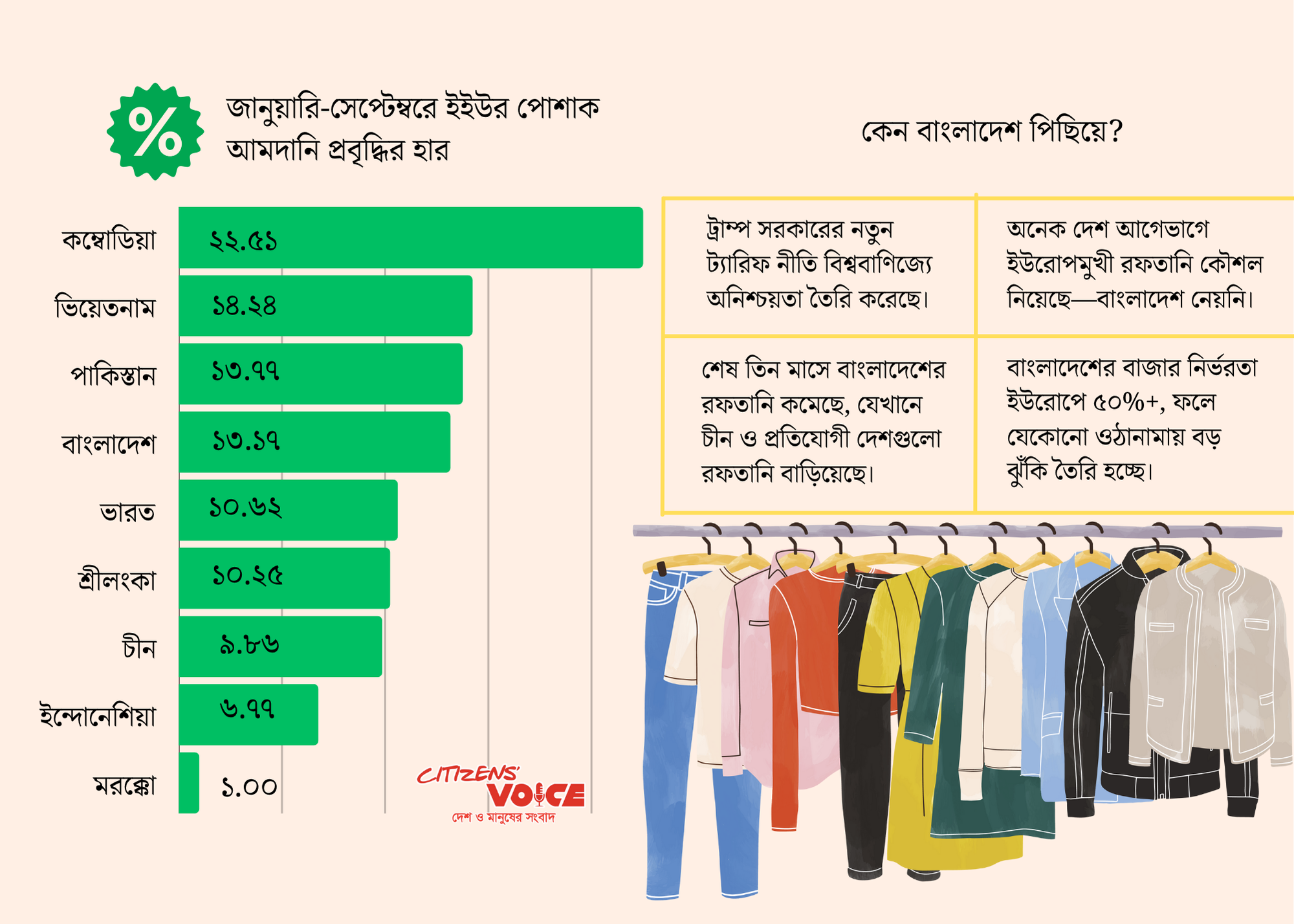 এ সময়ে বাংলাদেশ থেকে পোশাক আমদানি ১৩ শতাংশ বেড়েছে। কিন্তু প্রতিযোগী দেশ কম্বোডিয়া একই সময়ে ২২.৫ শতাংশ বৃদ্ধি দেখিয়েছে। ভিয়েতনাম ও পাকিস্তানের চেয়ে বাংলাদেশও পিছিয়ে রয়েছে। তথ্য এসেছে ইইউর পরিসংখ্যান অফিস ইউরোস্ট্যাটের বিশ্লেষণ থেকে। চলতি বছরের প্রথম নয় মাসে ইইউভুক্ত দেশগুলো বাংলাদেশ থেকে ১ হাজার ৫২৫ কোটি ৫২ লাখ ইউরোর পোশাক আমদানি করেছে। ২০২৪ সালের একই সময়ে এটি ছিল ১ হাজার ৩৪৭ কোটি ৯৫ লাখ ইউরো। বৃদ্ধির হার দাঁড়িয়েছে ১৩.১৭ শতাংশ।