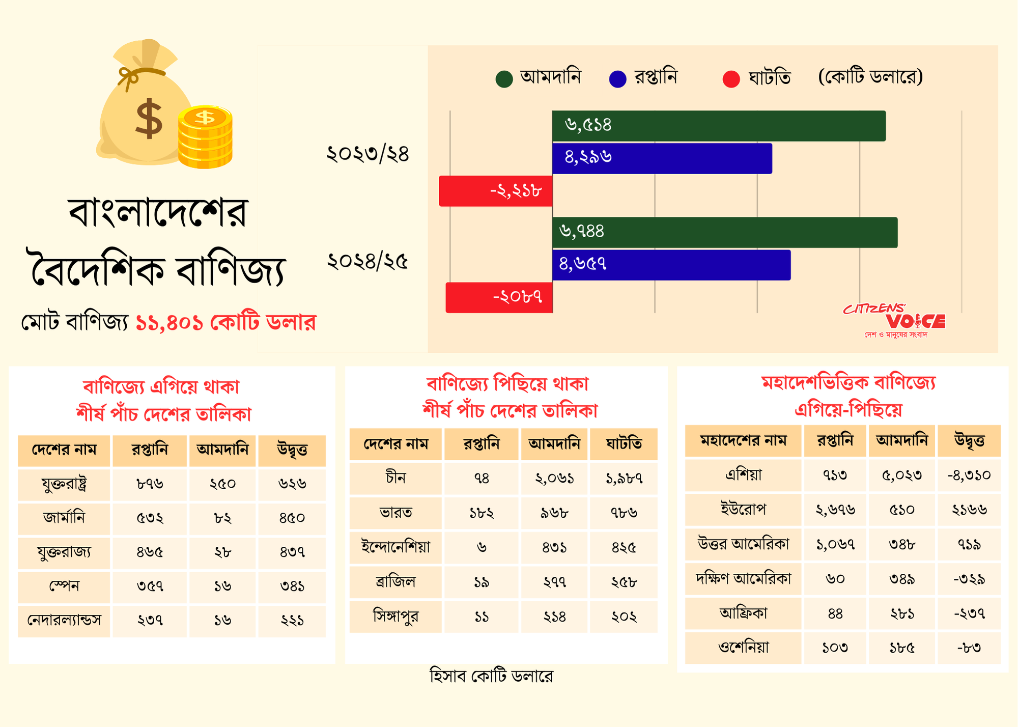 জাতীয় রাজস্ব বোর্ডের (এনবিআর) তথ্য অনুযায়ী, সর্বশেষ অর্থবছর ২০২৪–২৫ এ ১২২ দেশের সঙ্গে দ্বিপক্ষীয় বাণিজ্যে বাংলাদেশ এগিয়ে ছিল। কিন্তু ১০৪ দেশের সঙ্গে বাণিজ্যঘাটতিতে পড়ে দেশের অবস্থান। ঘাটতি এতটাই বেশি যে এগিয়ে থাকা ১২২ দেশের হিসাবেও বৈদেশিক বাণিজ্য ঘাটতি নিয়ন্ত্রণের বাইরে।