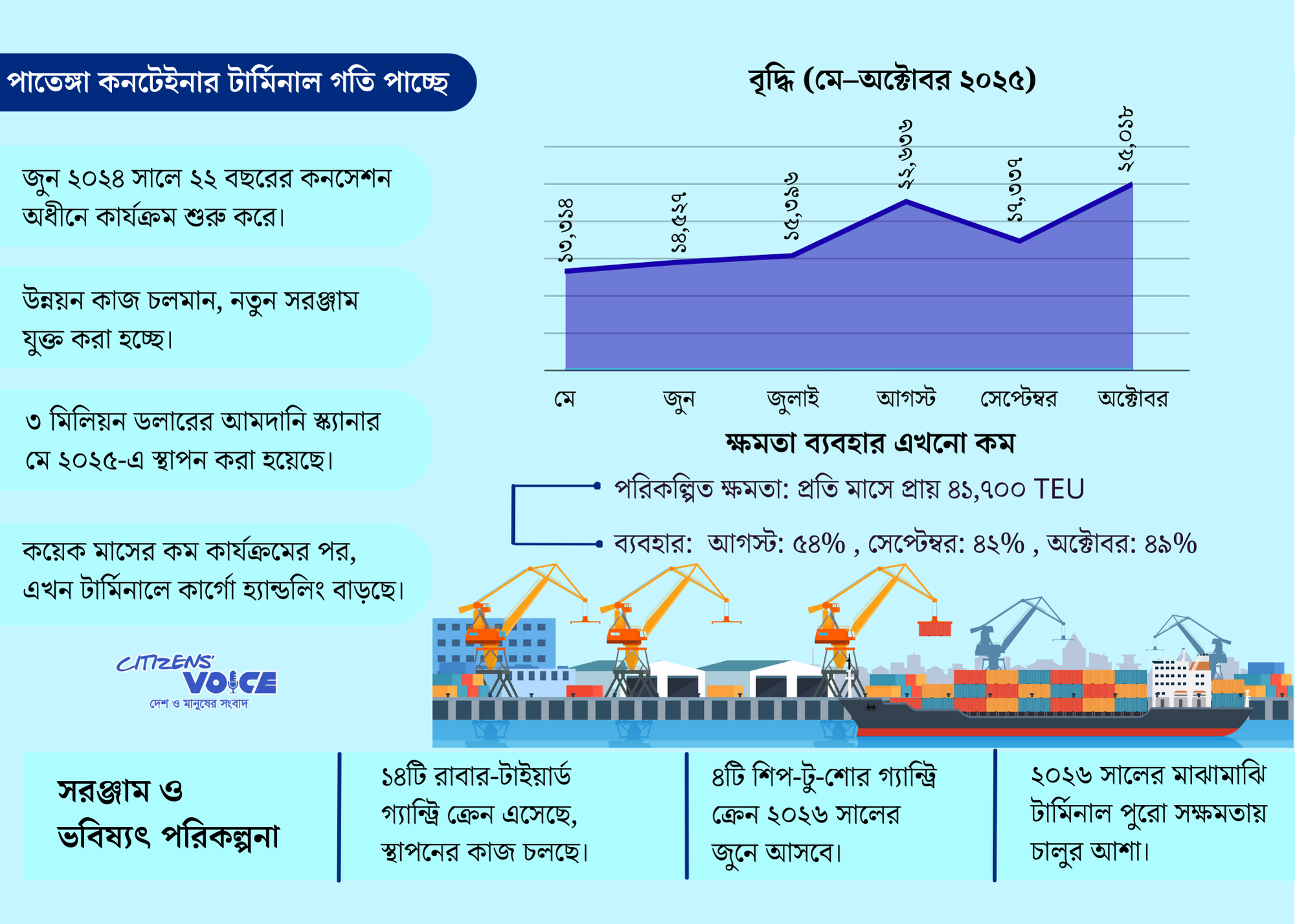 মাসওয়ারি হ্যান্ডলিংও ধারাবাহিকভাবে বেড়েছে। মে মাসে ১৩,৩১৪ টিইইউএস, জুনে ১৪,৫২৭, জুলাইয়ে ১৫,৩৯৬ এবং আগস্টে বেড়ে ২২,৬৩৬ টিইইউএসে পৌঁছেছে। সেপ্টেম্বর কমে ১৭,৩৩৭ টিইইউএস হলেও অক্টোবরে নতুন রেকর্ড করে ২৫,০১৮ টিইইউএস।