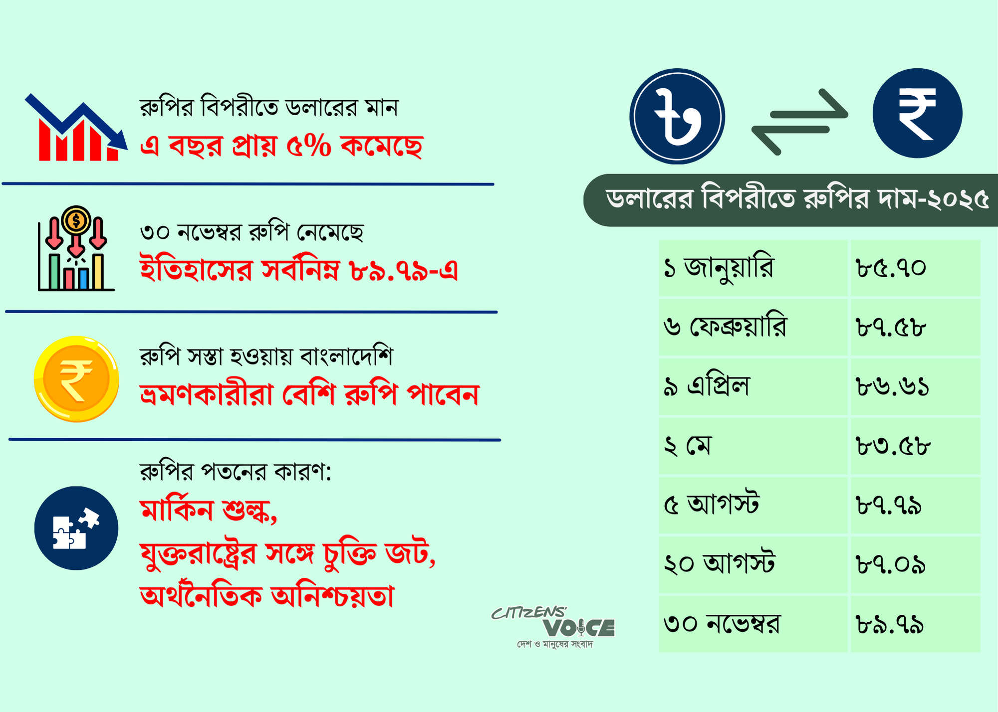 নভেম্বর মাসে ডলারের বিপরীতে রুপির পতন ০.৮ শতাংশ হয়েছে। ৩০ নভেম্বর প্রতি ডলারের বিপরীতে রুপি সর্বকালীন নিম্নমাত্রায় নেমে আসে- ৮৯.৭৯ রুপিতে। চলতি বছরের ১ জানুয়ারি রুপির বিনিময় হার ছিল ৮৫.৭০ রুপি।