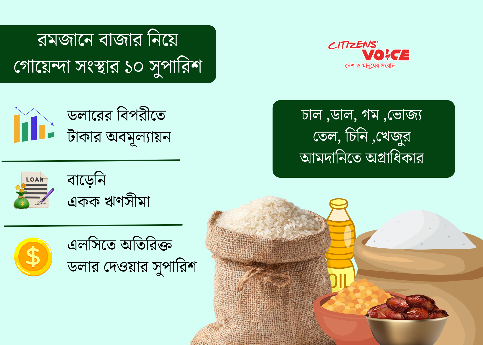 রমজাননির্ভর নিত্যপণ্যের বাজার পরিস্থিতি পর্যালোচনা ও করণীয় বিষয়ে তৈরি এক প্রতিবেদনে সরকারের একটি গোয়েন্দা সংস্থা এসব সুপারিশ করেছে। শীতকালে রোজা শুরু হওয়ায় শিল্পকারখানায় জ্বালানি সংকট দেখা দিতে পারে বলে আশঙ্কা প্রকাশ করা হয়েছে। সে কারণে মিল-কারখানায় ২৪ ঘণ্টা নিরবচ্ছিন্ন গ্যাস ও বিদ্যুৎ সরবরাহ নিশ্চিত করার সুপারিশও রয়েছে। গত নভেম্বরে প্রস্তুত করা এই প্রতিবেদনটি প্রধান উপদেষ্টার কার্যালয় এবং বাণিজ্য মন্ত্রণালয়ে পাঠানো হয়। প্রতিবেদনে আসন্ন রমজানে নিত্যপণ্যের দাম স্থিতিশীল রাখতে মোট ১০টি সুপারিশ করা হয়েছে।