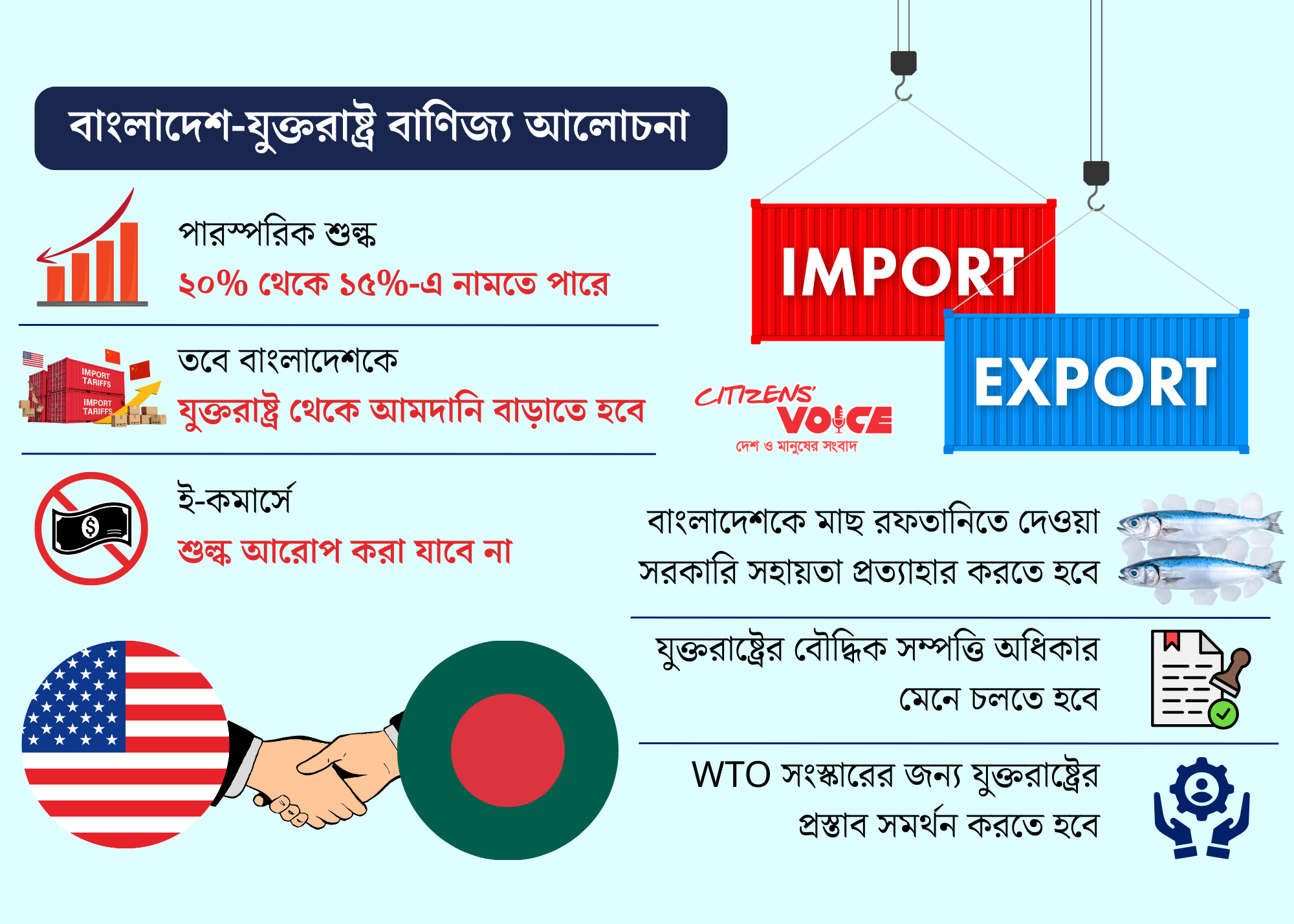শুল্কহারে এই ছাড়ের বিনিময়ে বাংলাদেশ কিছু শর্ত মানতে রাজি হয়েছে। এর মধ্যে রয়েছে—যুক্তরাষ্ট্র থেকে আমদানি বাড়ানো, ই-কমার্স পণ্য ও সেবায় শুল্ক আরোপ না করা, মৎস্য রপ্তানিতে ভর্তুকি প্রত্যাহার, মেধাস্বত্ব (আইপিআর) শর্ত মানা এবং বিশ্ব বাণিজ্য সংস্থা (ডব্লিউটিও) সংস্কারের প্রস্তাব সমর্থন করা।