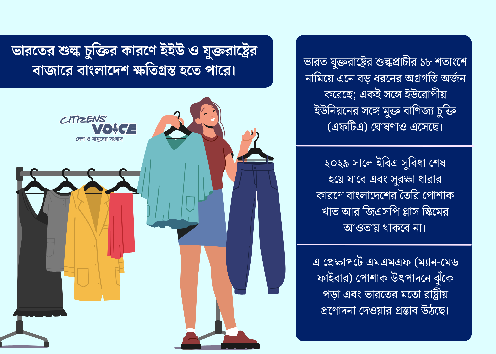 স্থানীয় পোশাক রপ্তানিকারীরা আশঙ্কা করছেন, ইউরোপীয় ইউনিয়ন-ভারত মুক্তবাণিজ্য চুক্তি ২০২৭ সালে কার্যকর হলে তাদের সঙ্গে কঠিন প্রতিযোগিতা শুরু হবে। কারণ এই চুক্তি ভারতের পোশাক উৎপাদকদের শুল্কমুক্ত সুবিধা দেবে, যেখানে বাংলাদেশ এখনও “সর্বত্র শুল্কমুক্ত ছাড়া অস্ত্র” সুবিধার অধীনে রয়েছে। তবে সর্বত্র শুল্কমুক্ত ছাড়া অস্ত্র সুবিধা বাংলাদেশ ২০২৯ সালে হারাবে, কারণ কম বিকশিত দেশ থেকে উত্তরণের ফলে দেশটি ২০২৬ সালের নভেম্বর থেকে তিন বছরের পরিবর্তনকালীন সময়ে প্রবেশ করবে।