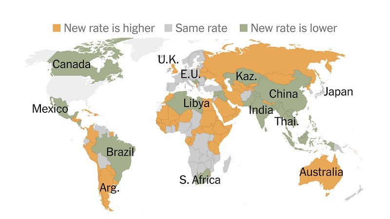 প্রতিবেশী দেশ কানাডা ও মেক্সিকোও ট্রাম্পের কঠোর নজরদারিতে রয়েছে। ফেন্টানিল চোরাচালান বন্ধ করতে না পারার অভিযোগে মেক্সিকোর ওপর ২৫ শতাংশ এবং কানাডার ওপর ৩৫ শতাংশ পর্যন্ত শুল্ক বসানোর ঘোষণা দেওয়া হয়েছিল। মানচিত্রে দেখা যাচ্ছে, তাদের অনেকের ওপর শুল্কের হার আগের চেয়ে কমেছে। তবু উত্তর আমেরিকান বাণিজ্যিক চুক্তি (ইউএসএমসিএ) নতুন করে পর্যালোচনার মুখে পড়েছে। অন্যদিকে অস্ট্রেলিয়া, রাশিয়া এবং আর্জেন্টিনা উচ্চ শুল্কের (কমলা চিহ্নিত) মুখোমুখি। ইউরোপীয় ইউনিয়ন, জাপান এবং দক্ষিণ কোরিয়ার মতো ঘনিষ্ঠ মিত্রদের সঙ্গে পূর্বে হওয়া চুক্তিগুলোও অনিশ্চয়তার মধ্যে পড়েছে। সেখানে ১৫ শতাংশ শুল্কের একটি ভিত্তি ধরা হয়েছে।