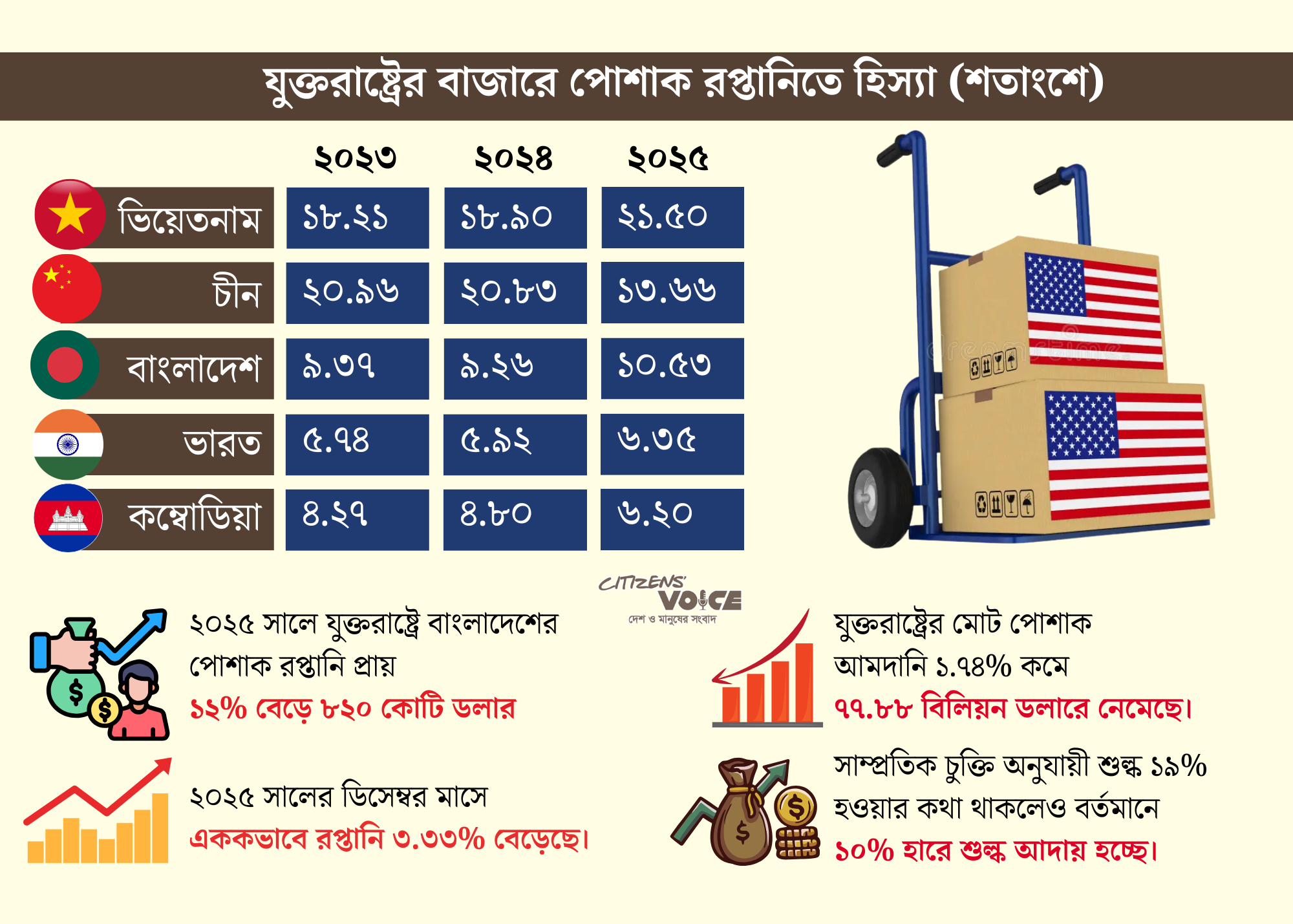 বিশ্ব অর্থনীতির অস্থিরতা এবং যুক্তরাষ্ট্রে সামগ্রিক আমদানি কমে যাওয়ার মধ্যেও ২০২৫ সালে বাংলাদেশের পোশাক রপ্তানি বৃদ্ধি পেয়েছে। বাণিজ্যিক হিসেবে দেশের রপ্তানি আয় দাঁড়িয়েছে ৮২০ কোটি ডলার, যা প্রায় ৯৮ হাজার ৫০০ কোটি টাকা। এই ফলাফল ধরে রেখেছে বাংলাদেশের তৃতীয় অবস্থান যুক্তরাষ্ট্রের পোশাক বাজারে। তবে চীন শীর্ষ রপ্তানিকারক দেশ হওয়ার মর্যাদা হারিয়েছে। চীনের স্থানে ভিয়েতনাম যুক্তরাষ্ট্রে শীর্ষে অবস্থান করছে, আর চীন নেমেছে দ্বিতীয় স্থানে।