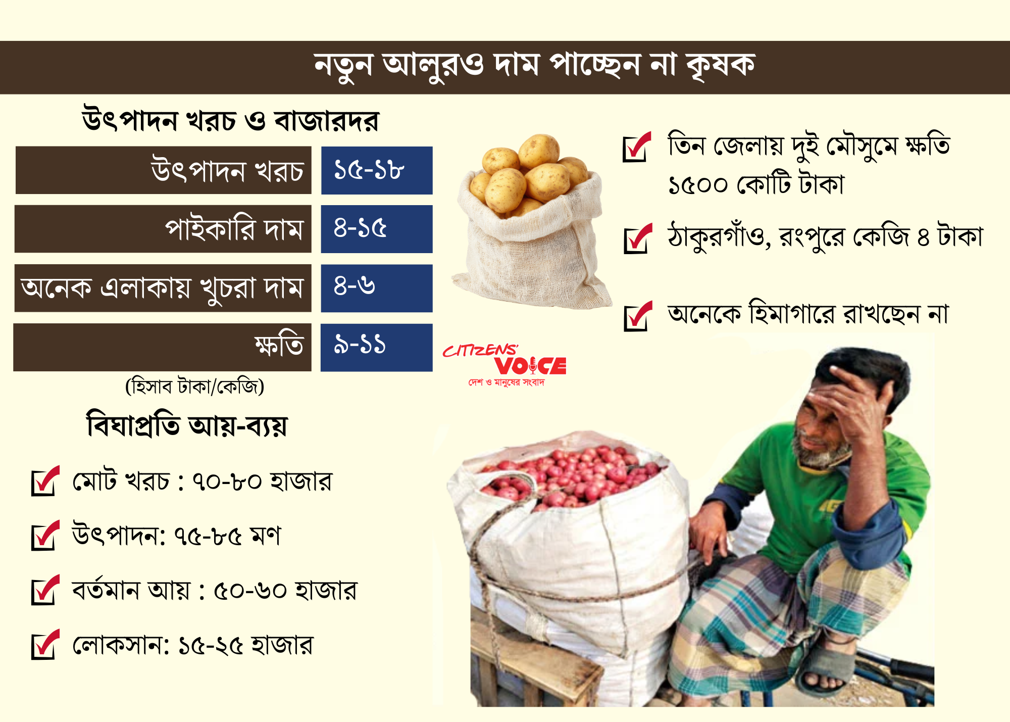 ভালো ফলন হলে ৭৫ থেকে ৮৫ মণ আলু পাওয়া যায়। কিন্তু বর্তমান বাজারদরে বিক্রি করে আয় হচ্ছে ৫০ থেকে ৬০ হাজার টাকা। অর্থাৎ বিঘাপ্রতি ১৫ থেকে ২৫ হাজার টাকা ঘাটতি।