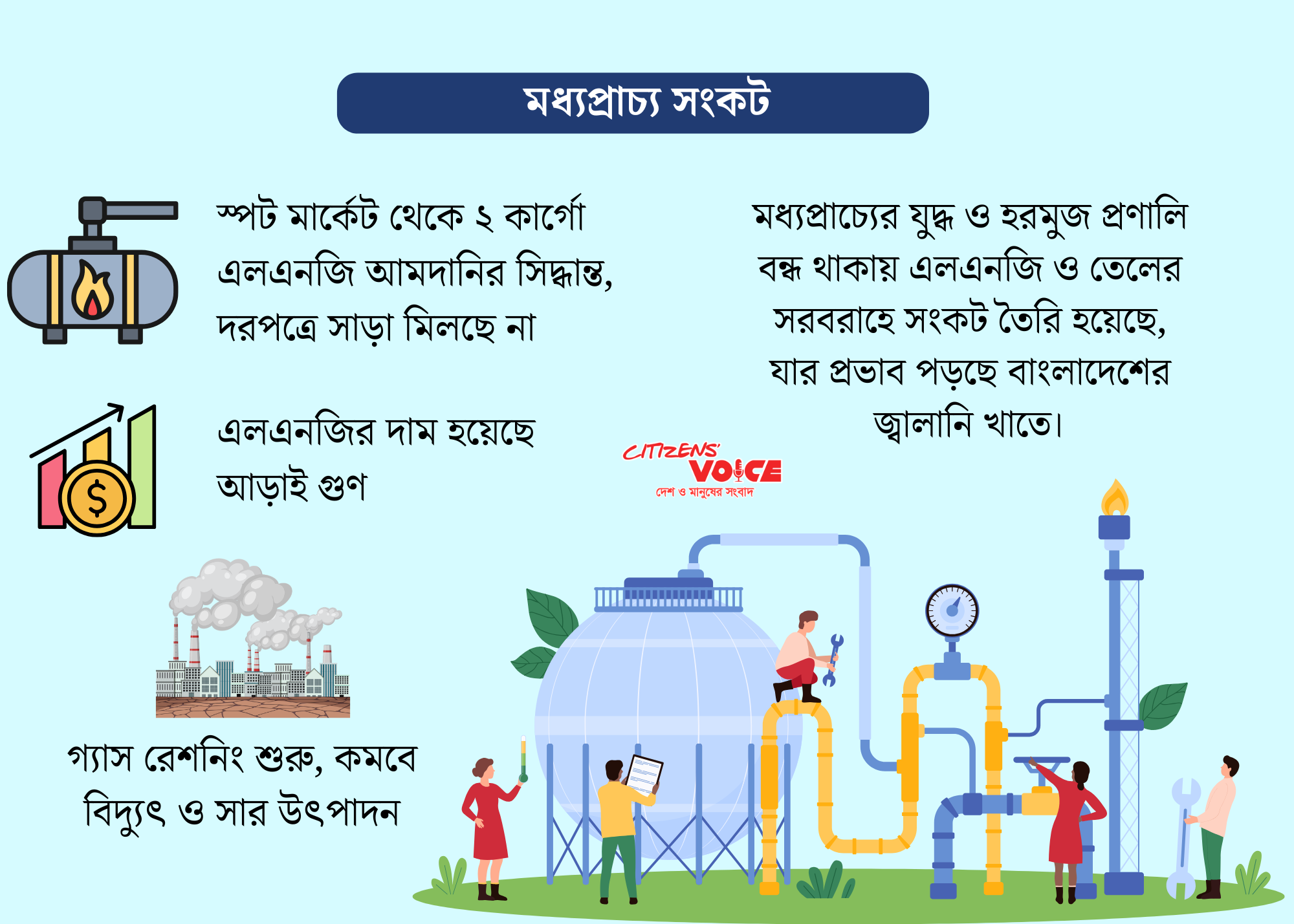 এলএনজির দাম ইতোমধ্যে প্রায় ৫০ শতাংশ বেড়ে গেছে। এর সরাসরি প্রভাব পড়বে বাংলাদেশে। কারণ কাতার বাংলাদেশের অন্যতম প্রধান এলএনজি সরবরাহকারী দেশ। চলতি মাসে কাতার থেকে নির্ধারিত দুটি এলএনজি কার্গো আসা নিয়ে অনিশ্চয়তা তৈরি হয়েছে। এই পরিস্থিতিতে সরকার স্পট মার্কেট থেকে আরও দুটি এলএনজি কার্গো আমদানির উদ্যোগ নিয়েছে। তবে এখনো সরবরাহকারীদের কাছ থেকে প্রত্যাশিত সাড়া মেলেনি। জ্বালানি সরবরাহ স্থিতিশীল রাখতে ইতোমধ্যে বিদ্যুৎকেন্দ্র ও সার কারখানায় গ্যাস রেশনিং শুরু হয়েছে।