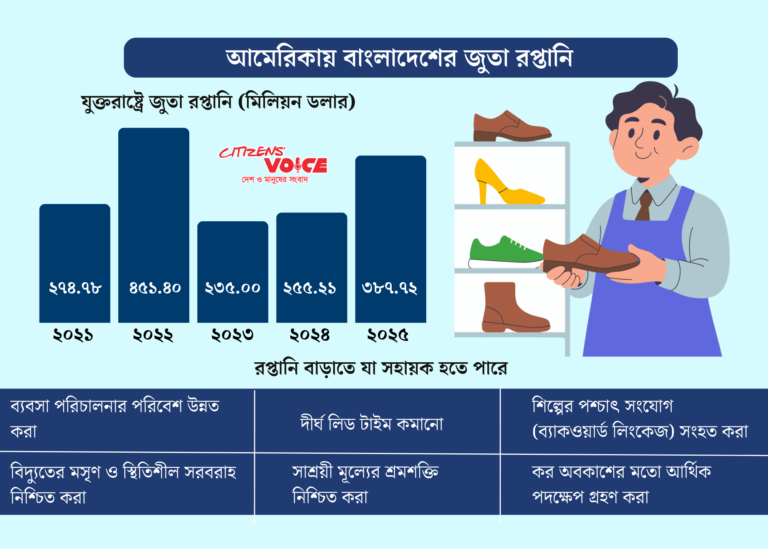 আন্তর্জাতিক বাজারে সরবরাহ শৃঙ্খলে পরিবর্তন এবং নতুন উৎস খোঁজার প্রবণতা অব্যাহত থাকলে বাংলাদেশের জুতা শিল্প আগামী বছরগুলোতে যুক্তরাষ্ট্রের বাজারে আরও বড় অংশীদার হয়ে উঠতে পারে।