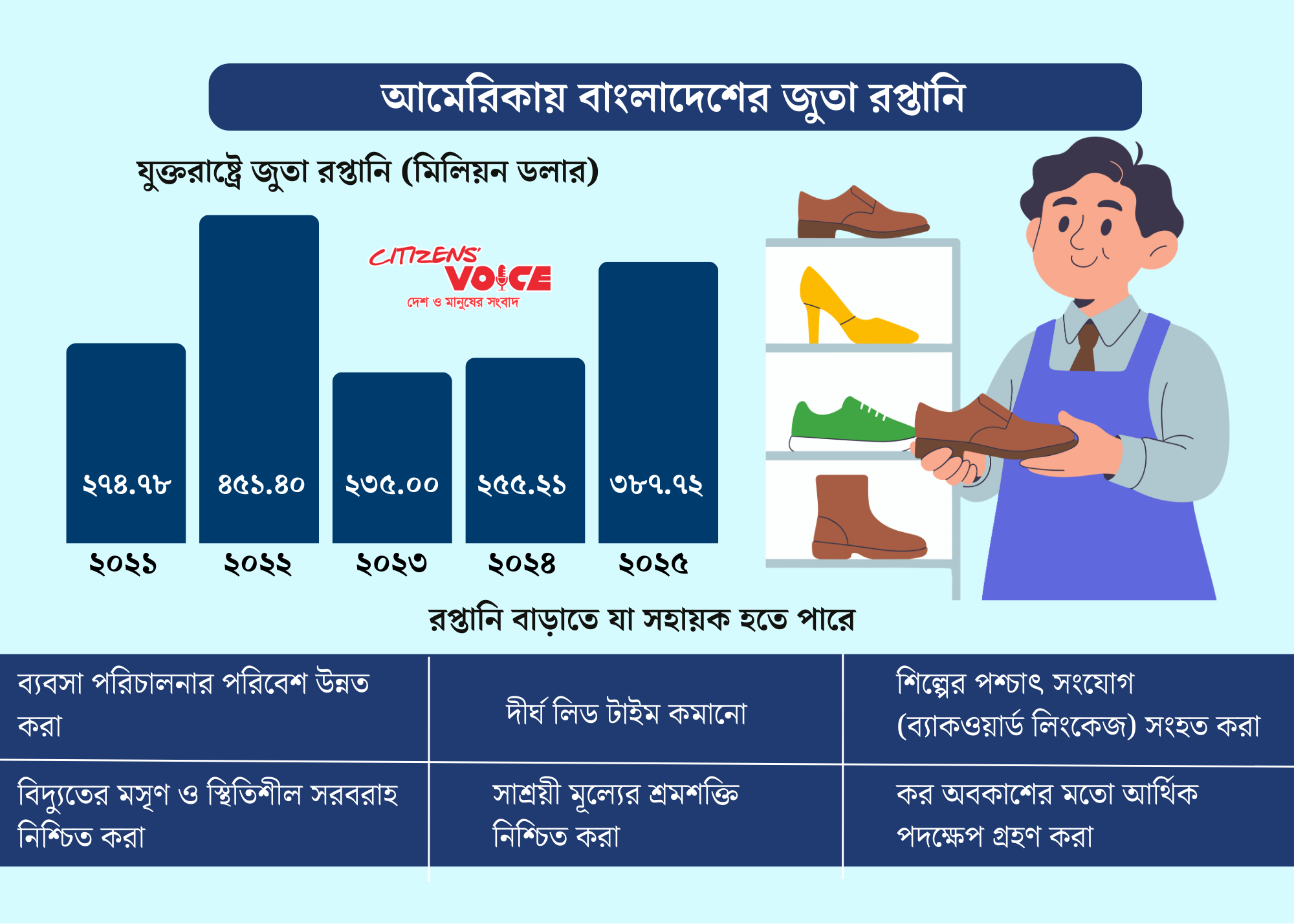 যুক্তরাষ্ট্রের বাণিজ্য বিভাগের অধিভুক্ত সংস্থা অফিস অব টেক্সটাইলস অ্যান্ড অ্যাপারেল (OTEXA)–এর তথ্য অনুযায়ী, ২০২৫ সালে বাংলাদেশ থেকে যুক্তরাষ্ট্রে জুতা রপ্তানির পরিমাণ দাঁড়িয়েছে ৩৮৭ দশমিক ৭২ মিলিয়ন ডলার। এর আগের বছর ২০২৪ সালে এই রপ্তানির পরিমাণ ছিল ২৫৫ দশমিক ২১ মিলিয়ন ডলার। অর্থাৎ এক বছরের ব্যবধানে প্রায় ৫২ শতাংশ প্রবৃদ্ধি অর্জন করেছে খাতটি।