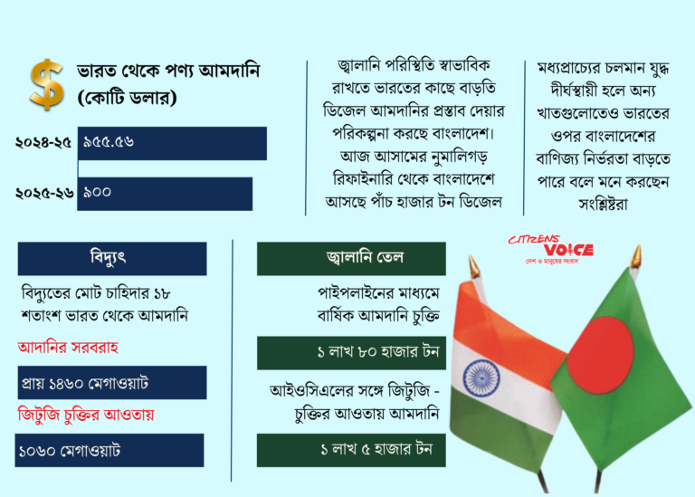 বিশ্বব্যাপী জ্বালানি সংকটের প্রেক্ষাপটে বাংলাদেশে তেল, এলপিজি ও এলএনজি আমদানিতে বড় ধরনের আর্থিক চাপ তৈরি হয়েছে। এই পরিস্থিতিতে প্রতিবেশী দেশ ভারত থেকে জ্বালানি সহযোগিতা বাড়ানোর ওপর জোর দিয়েছে সরকার। দেশের বিদ্যুৎ ও জ্বালানি খাতের প্রায় ১৮ শতাংশ চাহিদা ভারতের ওপর নির্ভরশীল। এছাড়া ডিজেল, ফার্নেস অয়েল, জেট ফুয়েল ও অকটেনও আমদানি করা হচ্ছে। ২০২৬ সালে ভারত থেকে জ্বালানি পণ্যের আমদানি লক্ষ্য প্রায় তিন লাখ টন। বিদ্যুৎ ক্রয়চুক্তির আওতায় বিদ্যুৎ আমদানি চুক্তি রয়েছে ২ হাজার ৭৬০ মেগাওয়াট।