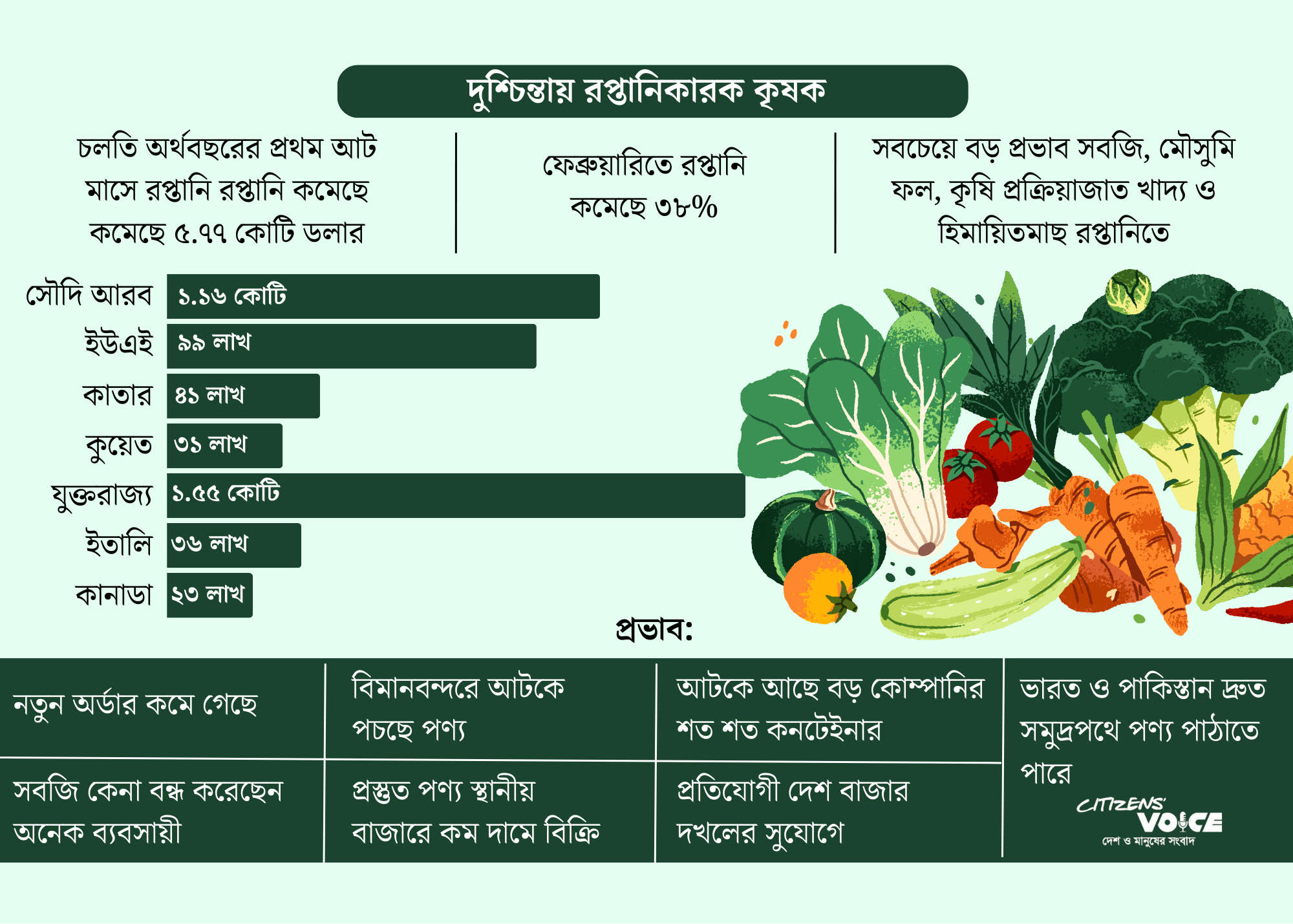 বাংলাদেশ ফ্রুটস, ভেজিটেবলস অ্যান্ড অ্যালাইড প্রডাক্টস এক্সপোর্টার্স অ্যাসোসিয়েশনের সাধারণ সম্পাদক মোহাম্মদ মনসুর জানিয়েছেন, টরন্টো, যুক্তরাজ্য ও ইতালিতে সামান্য কিছু পণ্য পাঠানো হচ্ছে, বাকি বাজারে রপ্তানি বন্ধ। প্রতিদিন প্রায় দেড় লাখ ডলারের রপ্তানি আটকে যাচ্ছে।