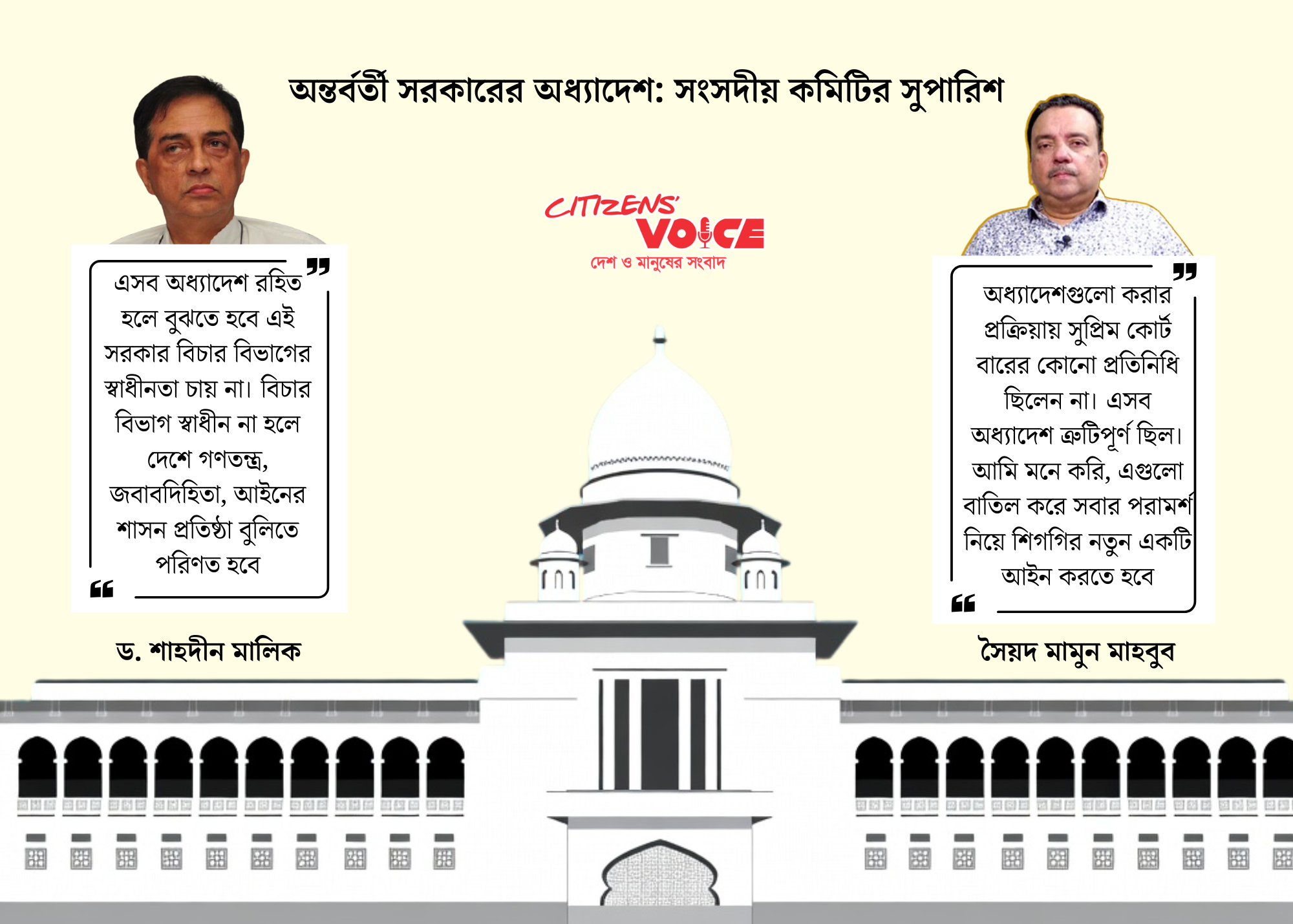 এদিকে, অন্তর্বর্তী সরকারের জারি করা মোট ১৩৩টি অধ্যাদেশ যাচাইয়ের দায়িত্বে থাকা সংসদীয় বিশেষ কমিটি গত বৃহস্পতিবার সংসদে তাদের প্রতিবেদন জমা দেয়। কমিটির সভাপতি জয়নুল আবেদীন প্রতিবেদনটি উপস্থাপন করেন। সেখানে বিচার বিভাগসংক্রান্ত গুরুত্বপূর্ণ দুটি অধ্যাদেশ কার্যত বাতিলের সুপারিশ করা হয়।