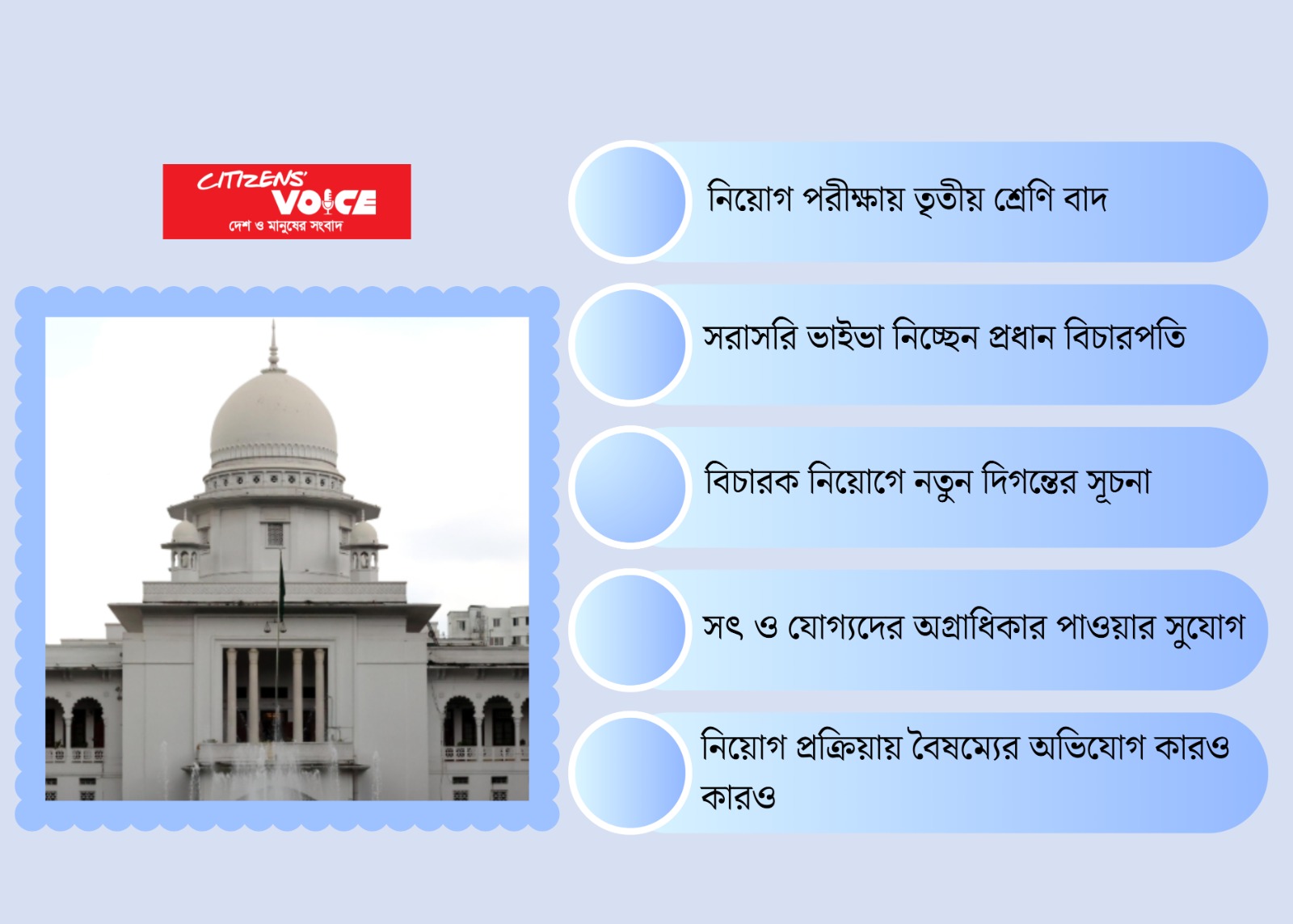 গত বছরের ৫ আগস্ট দেশে রাজনৈতিক পরিবর্তনের পর বিচার বিভাগেও সংস্কারের হাওয়া লাগে। বিশেষ করে বিচারক নিয়োগের ক্ষেত্রে রাজনৈতিক প্রভাব ও সুপারিশ এড়াতে উদ্যোগ নেয় অন্তর্বর্তীকালীন সরকার। সেই ধারাবাহিকতায় সুপ্রিম কোর্টের হাইকোর্ট বিভাগে বেশ কিছু অতিরিক্ত বিচারক নিয়োগের প্রক্রিয়া শুরু হয়েছে।