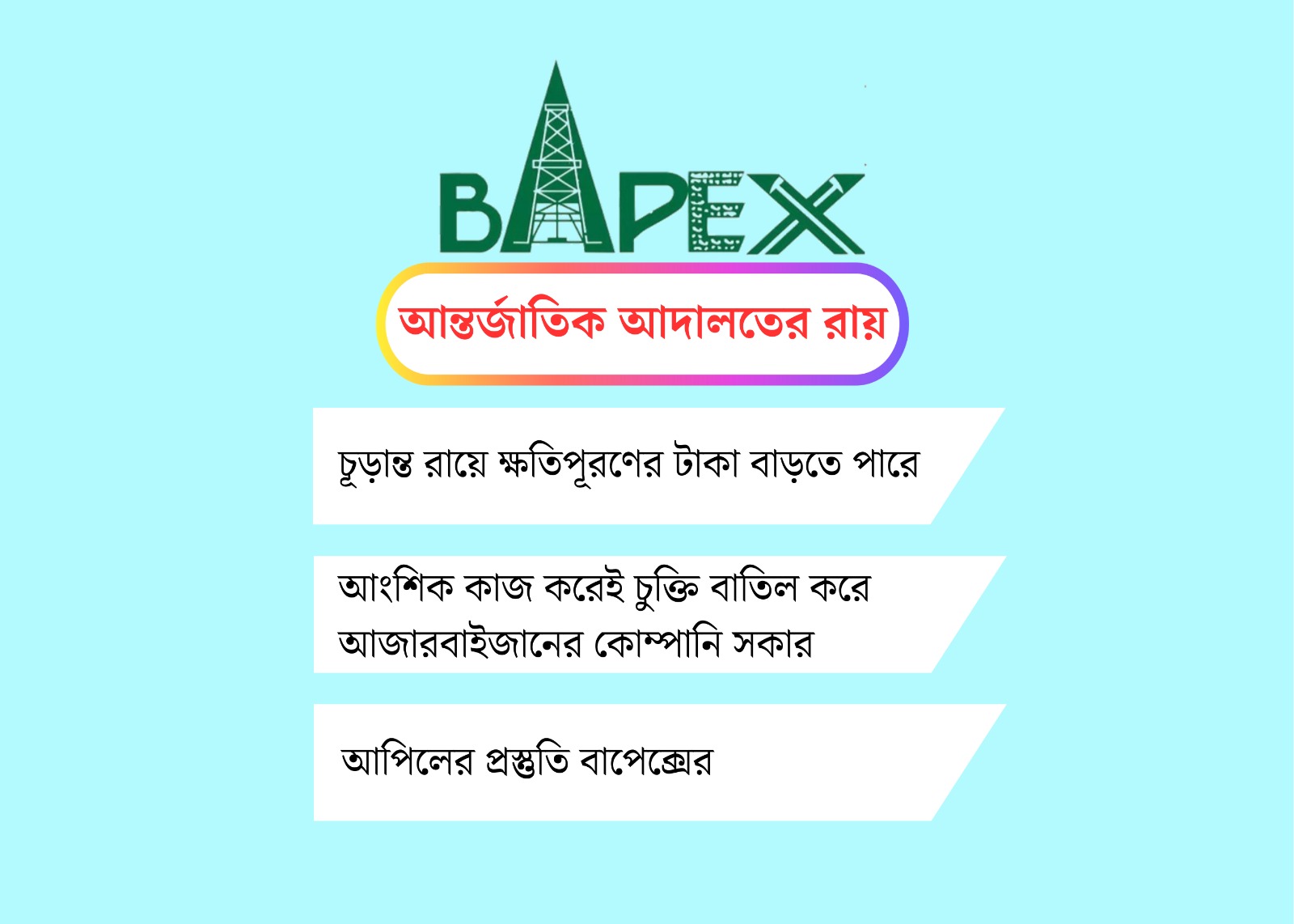 তেল ও গ্যাস অনুসন্ধানের রাষ্ট্রীয় প্রতিষ্ঠান বাপেক্স প্রাথমিকভাবে ৫২০ কোটি টাকা ক্ষতিপূরণের মুখে পড়েছে। বিষয়টি আন্তর্জাতিক বিরোধ নিষ্পত্তি আদালতে বিদেশি কোম্পানি আজারবাইজানের সকারের করা মামলার পর এসেছে।