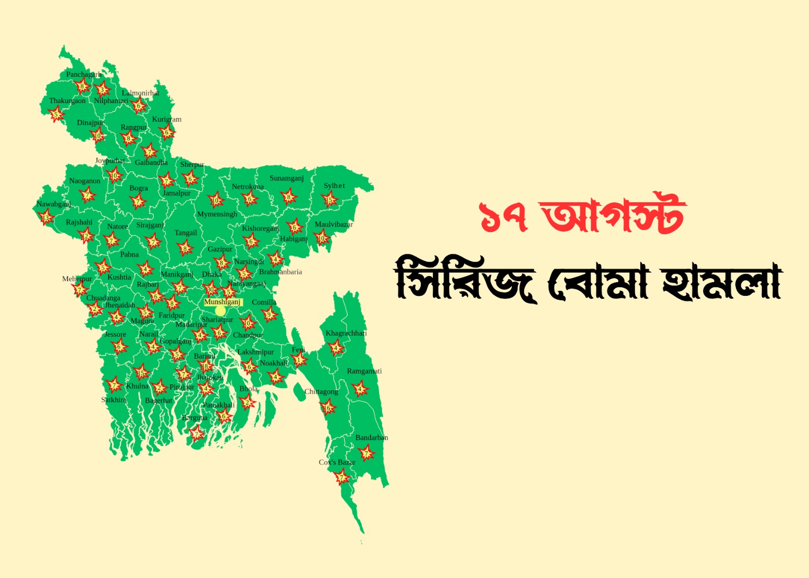 ২০০৫ সালের ১৭ আগস্ট দেশের ৬৩টি জেলা একযোগে বোমা হামলায় কেঁপে ওঠে। হামলাটি চালায় জামাআতুল মুজাহিদীন বাংলাদেশ (জেএমবি) নামের একটি জঙ্গি সংগঠন। এই ঘটনায় দুই জন নিহত হন এবং দুই শতাধিক মানুষ আহত হন।