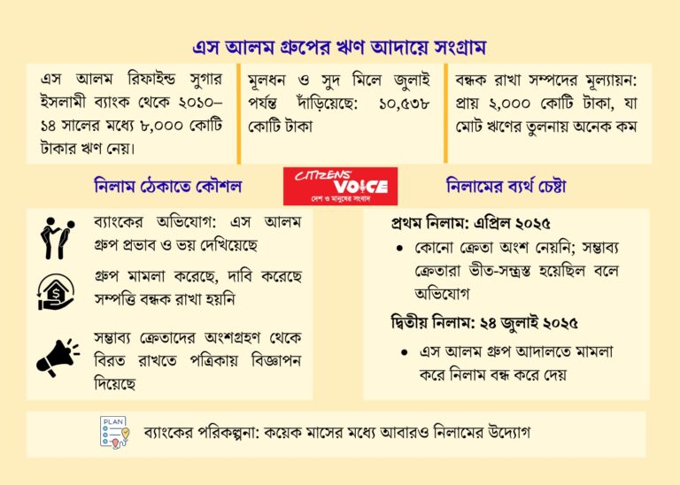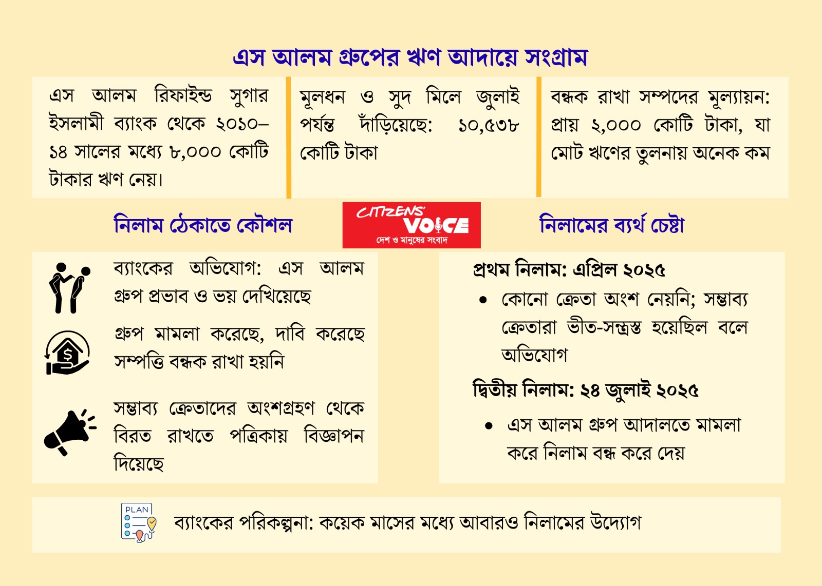 কয়েক বছর ধরে ইসলামী ব্যাংক ও এস আলম গ্রুপের মধ্যে এই ঋণ উদ্ধারের লড়াই চলছেই। ব্যাংক জানিয়েছে, মর্টগেজ করা সম্পত্তি নিলামে তোলার চেষ্টা ব্যর্থ হয়েছে। খাতুনগঞ্জ কর্পোরেট শাখার কর্মকর্তারা জানিয়েছেন, এস আলম রিফাইন্ড সুগার ইন্ডাস্ট্রিজ লিমিটেডের নামে নেওয়া ঋণ উদ্ধারে প্রথম দুটি নিলামে কোনো বিডার আসেনি। তাদের অভিযোগ, প্রতিষ্ঠানটি ভীতিপ্রদর্শন ও আইনি কৌশলের মাধ্যমে বিক্রয় প্রক্রিয়া আটকে দিয়েছে। দ্বিতীয়বার নিলাম ডাকার পর আদালতে মামলা করা হয়। এতে দাবি করা হয়, যেসব সম্পত্তি নিলামে তোলা হচ্ছে, সেগুলো ব্যাংকের কাছে মর্টগেজ করা হয়নি।