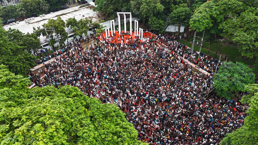 ২০২৪ সালের ৩ আগস্ট তোলা একটি ছবি দেখাচ্ছে কীভাবে কেন্দ্রীয় শহীদ মিনার জুলাই গণঅভ্যুত্থানকে অনুপ্রেরণা দিয়েছে। তা সত্ত্বেও, জুলাই ঘোষণাপত্রে ভাষা আন্দোলনের স্থান নেই। এরপর আসে প্রেসিডেন্ট জিয়াউর রহমান প্রণীত দায়মুক্তি আইন। পঞ্চম সংশোধনীর মাধ্যমে ১৯৭৫ সালের ১৫ আগস্ট থেকে ১৯৭৯ সালের ৯ এপ্রিল পর্যন্ত সব কার্যক্রম ও সাংবিধানিক পরিবর্তনকে বৈধতা দেওয়া হয়। এর মাধ্যমে আত্মস্বীকৃত খুনিদের সাংবিধানিক সুরক্ষা দেওয়া হয় এবং সংবিধানের নৈতিক মূল্য ক্ষতিগ্রস্ত হয়।