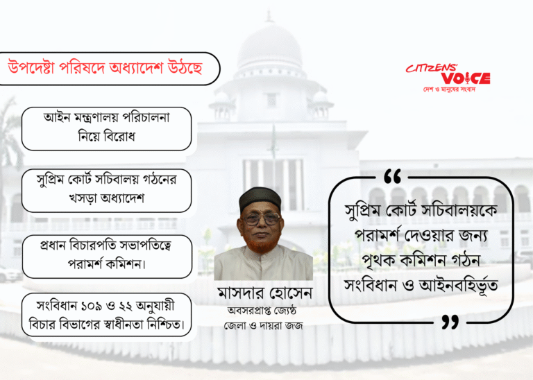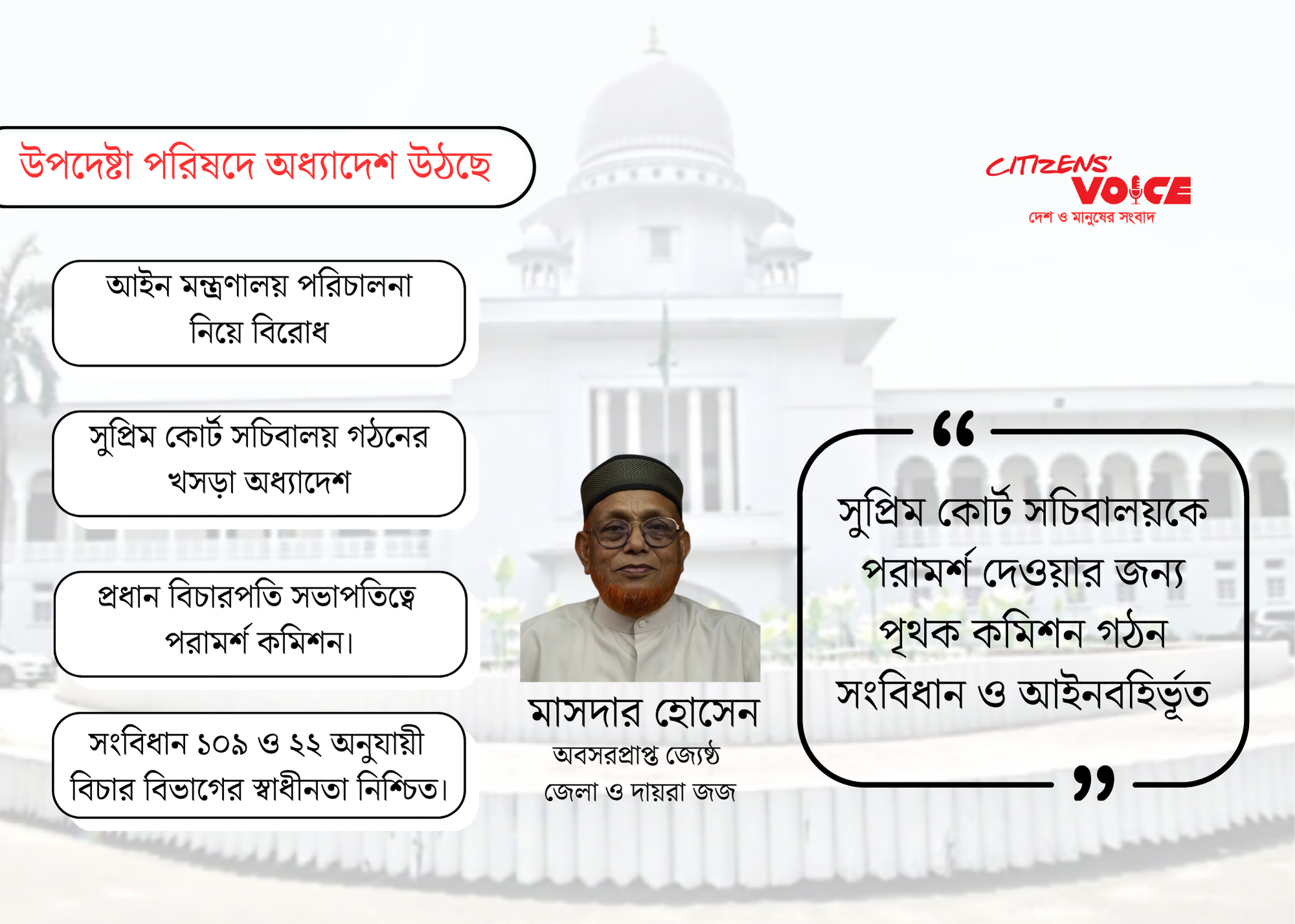 আজ বৃহস্পতিবার উপদেষ্টা পরিষদের বৈঠকে ‘সুপ্রিম কোর্ট সচিবালয় অধ্যাদেশ, ২০২৫’-এর খসড়া নিয়ে আলোচনা হবে। বৈঠকটি রাজধানীর তেজগাঁওয়ে প্রধান উপদেষ্টার কার্যালয়ে অনুষ্ঠিত হবে। বৈঠকের সভাপতিত্ব করবেন ড. মুহাম্মদ ইউনূস। বিচার প্রশাসনের বিশেষজ্ঞরা কমিশন গঠনের প্রস্তাবে আপত্তি জানিয়েছেন। তাদের মতে, সংবিধান এবং মাসদার হোসেন মামলার আলোকে এমন কোনো কমিশন গঠনের সুযোগ নেই। তাদের প্রশ্ন, প্রশাসনের লোক সুপ্রিম কোর্ট সচিবালয়ে ঢুকলে বিচার বিভাগের স্বাধীনতা বজায় থাকবে কীভাবে?
