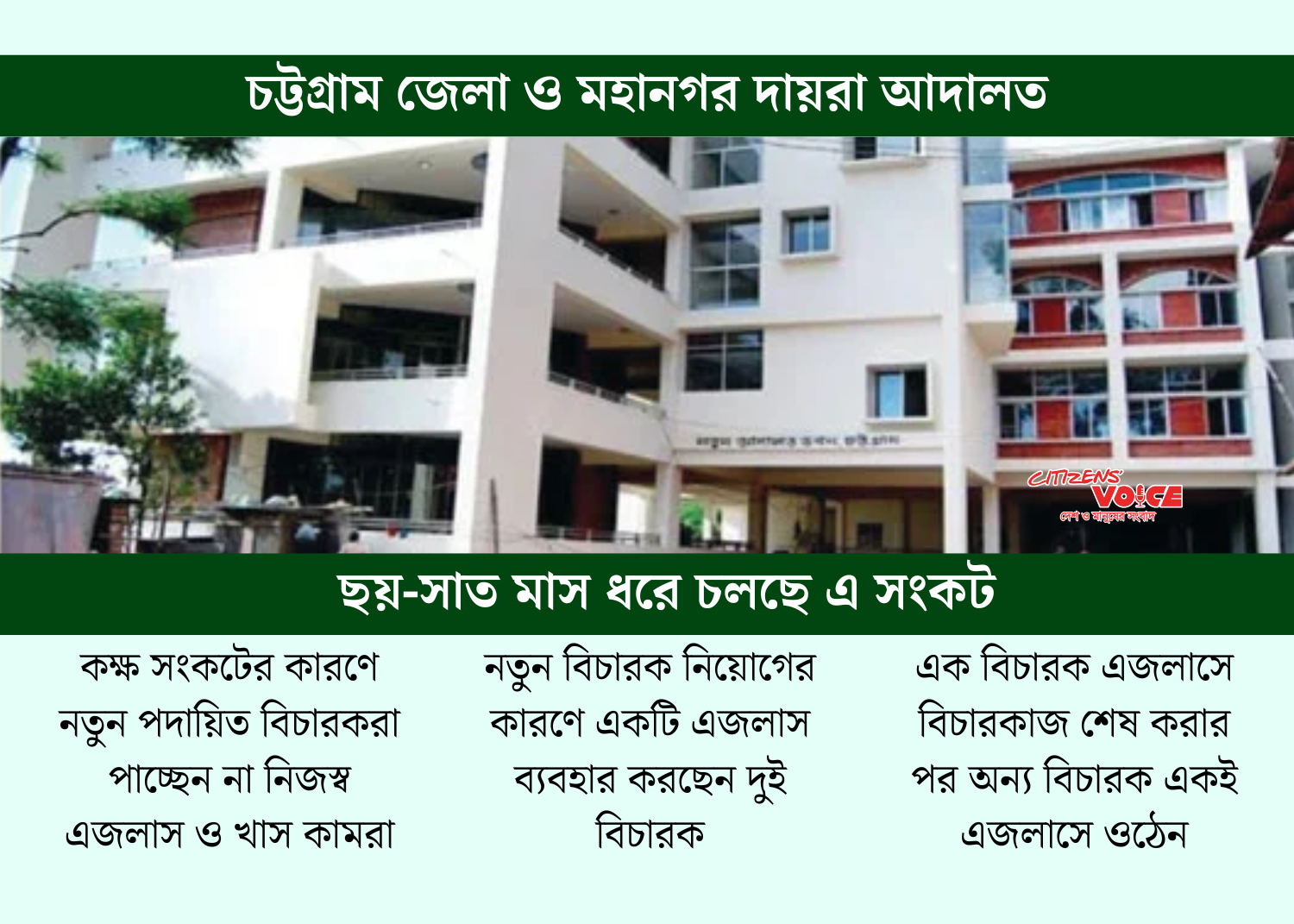 চট্টগ্রামের আদালতপাড়ায় বিচারক বাড়ানো হলেও অবকাঠামো বাড়েনি। ফলে এজলাস ও খাস কামরা সংকটে ২৯ বিচারককে ভাগাভাগি করে বিচারিক কাজ চালাতে হচ্ছে। এতে বিচারপ্রার্থীদের ভোগান্তিও বাড়ছে।