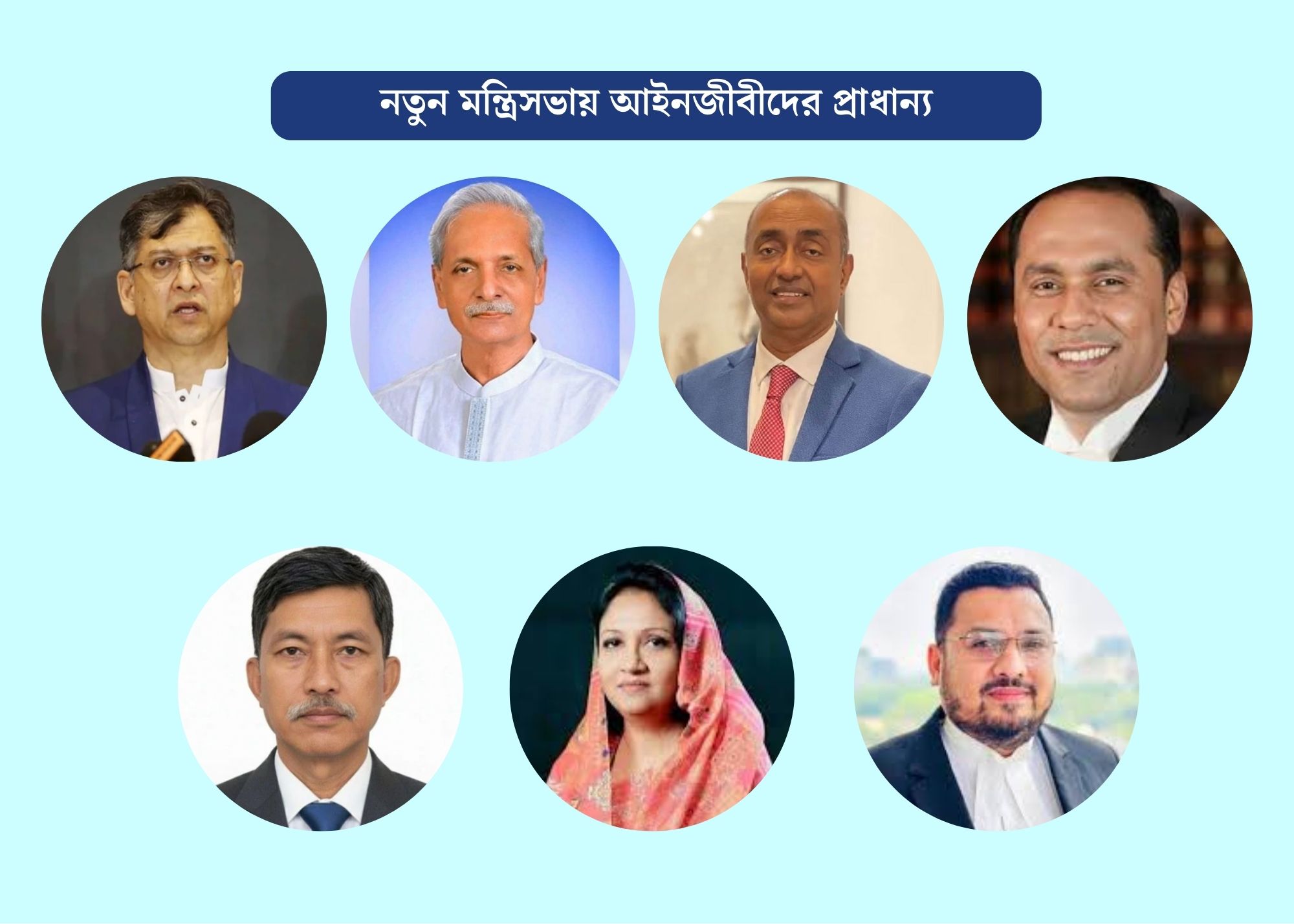 ত্রয়োদশ জাতীয় সংসদ নির্বাচনের পর গঠিত বিএনপি নেতৃত্বাধীন সরকারের মন্ত্রিসভায় আইনজীবীদের উপস্থিতি চোখে পড়ার মতো। সাতজন নতুন মন্ত্রীর মধ্যে পাঁচজনই সুপ্রিম কোর্টের নিয়মিত আইনজীবী।