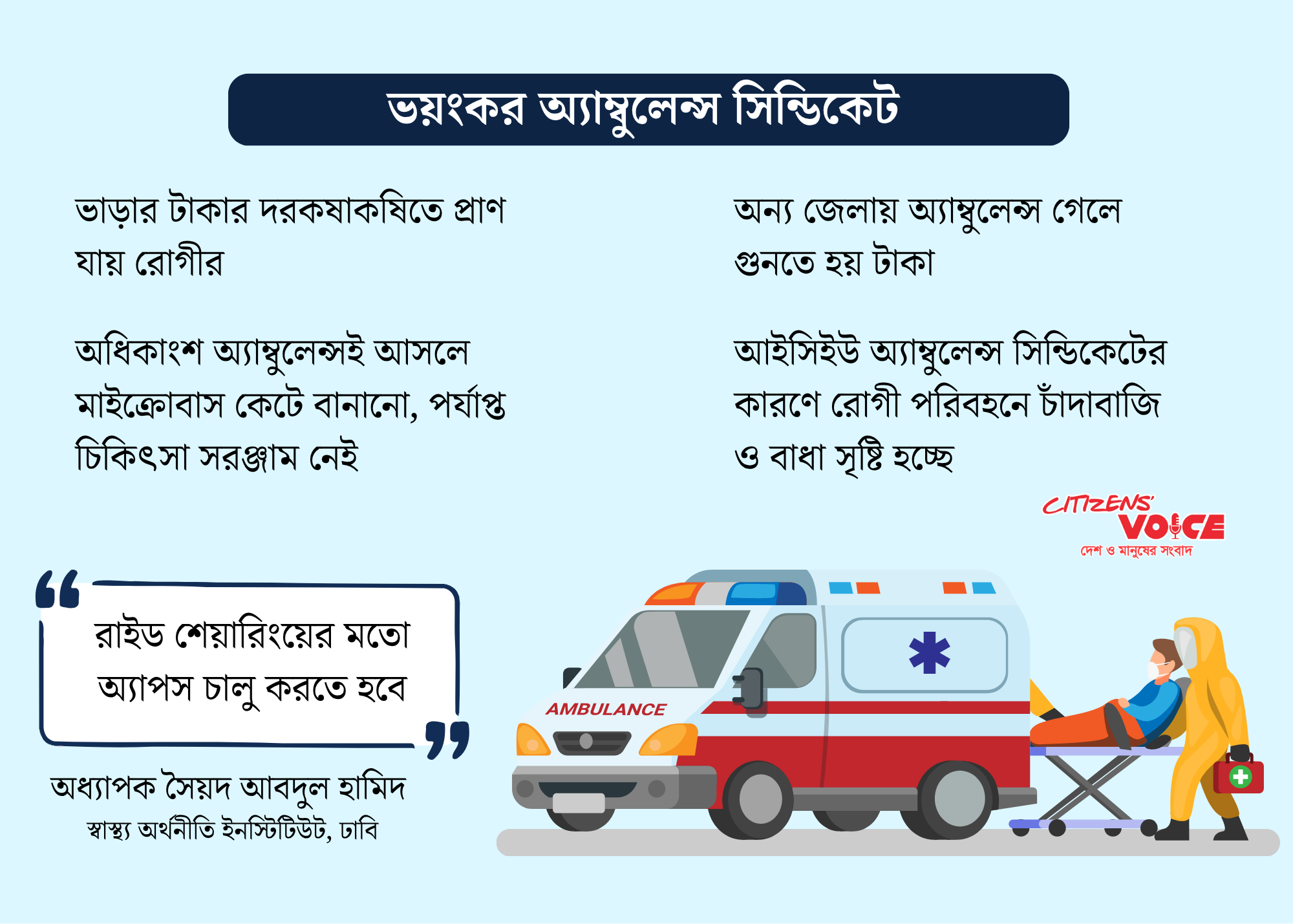 এ ঘটনাকে ঘিরে দেশের সরকারি ও বেসরকারি বড় হাসপাতালগুলোর আশপাশে গড়ে ওঠা অ্যাম্বুলেন্স সিন্ডিকেট নিয়ে আবারও প্রশ্ন উঠেছে। অভিযোগ রয়েছে, এসব সিন্ডিকেটের কারণে রোগী ও স্বজনরা অনেক সময় জিম্মি হয়ে পড়েন। এক শহর থেকে অন্য শহরে রোগী পরিবহন করা গেলেও অনেক ক্ষেত্রে একই শহরের ভেতরে বা নির্দিষ্ট এলাকায় প্রবেশ নিয়েও বাধা তৈরি হয়।