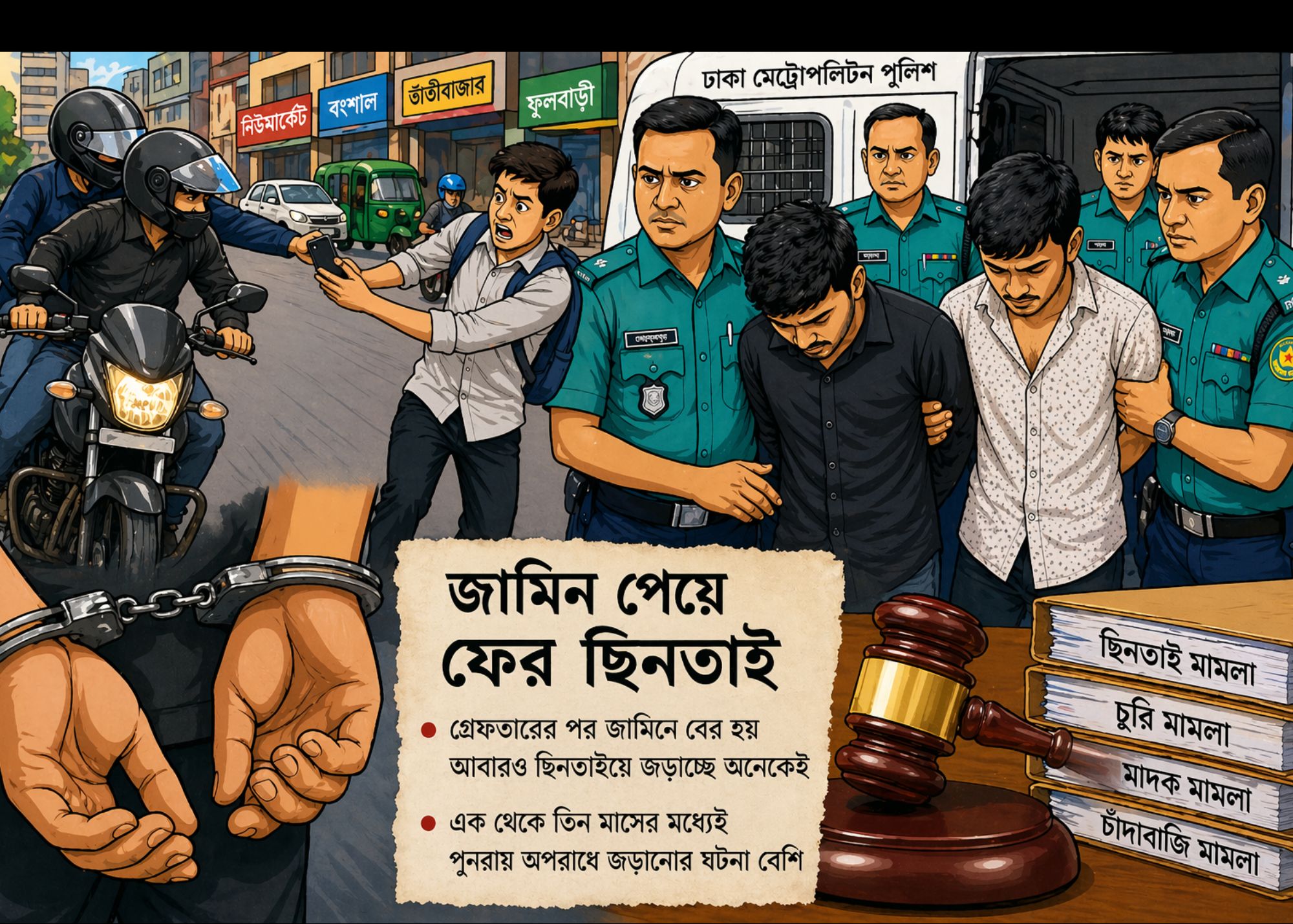 রাজধানীতে ছিনতাই ও চুরির মামলায় গ্রেফতার হয়ে জামিনে বের হওয়ার পর আবারও অপরাধে জড়িয়ে পড়ার একাধিক ঘটনা সামনে এসেছে। মাত্র এক মাসের ব্যবধানে একই ব্যক্তিরা পুনরায় ছিনতাইয়ে যুক্ত হওয়ায় আইনশৃঙ্খলা পরিস্থিতি নিয়ে নতুন করে প্রশ্ন উঠেছে।