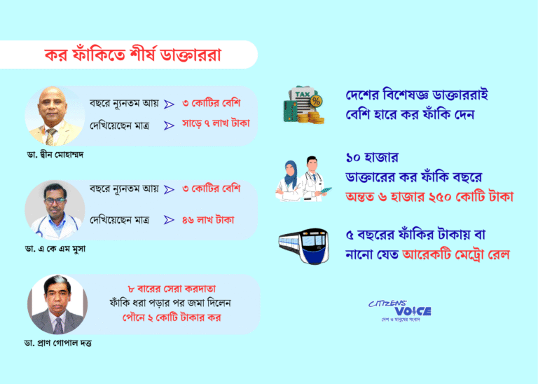 কর কর্মকর্তারা বলছেন, উচ্চ আয়ের চিকিৎসকদের বেশিরভাগই সঠিকভাবে কর দেন না। তাঁদের মধ্যে অন্তত ১০ হাজার ডাক্তার বছরে গড়ে ৬২ লাখ ৫০ হাজার টাকা করে কর ফাঁকি দেন, যা মোট ৬২৫০ কোটি টাকা। যদি এ প্রবণতা পাঁচ বছর ধরে চলে, তাহলে অঙ্ক দাঁড়াবে ৩১,২৫০ কোটি টাকা—যা দিয়ে নতুন একটি মেট্রোরেল প্রকল্প নির্মাণ সম্ভব।