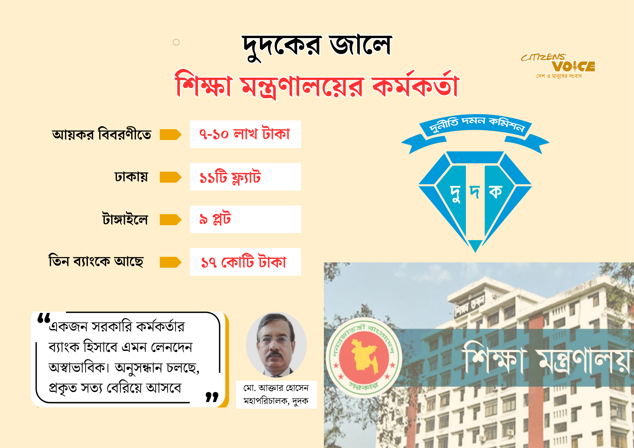 শিক্ষা মন্ত্রণালয়ের সাধারণ একজন সহকারী সচিব তিনি। বেতন স্কেল অনুযায়ী, তার মাসিক আয় সর্বোচ্চ ৬৫ থেকে ৭০ হাজার টাকা। সেখানে তার বাৎসরিক সঞ্চয় কোনোভাবেই কোটির ঘর ছোঁয়ার কথা নয়। অথচ, শিক্ষা মন্ত্রণালয়ের সহকারী সচিব মো. সেলিম শিকদারের তিনটি ব্যাংক হিসাবে মিলেছে প্রায় ১৭ কোটি টাকার রহস্যময় লেনদেন। একজন তৃতীয় শ্রেণির কর্মচারী হিসেবে যিনি কর্মজীবন শুরু করেছিলেন, যার আয়কর বিবরণীতে বছরে মাত্র সাত থেকে ১০ লাখ টাকার আয় দেখানোর কথা, সেখানে বিপুল পরিমাণ এই অর্থের উৎস কোথায়— প্রশ্ন জাগাটা স্বাভাবিক।
